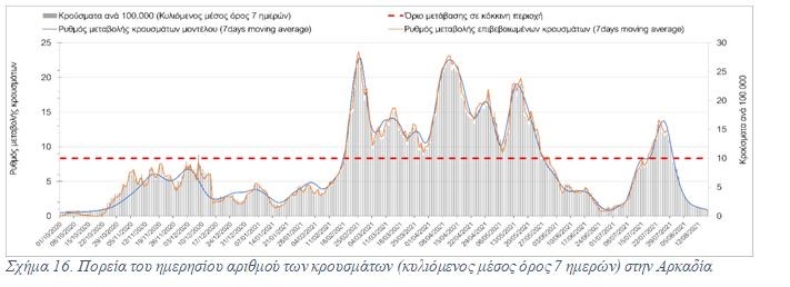 Σχήμα 16. Πορεία του ημερησίου αριθμού των κρουσμάτων (κυλιόμενος μέσος όρος 7 ημερών) στην Αρκαδία