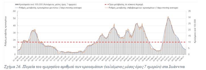 Σχήμα 26. Πορεία του ημερησίου αριθμού των κρουσμάτων (κυλιόμενος μέσος όρος 7 ημερών) στα Ιωάννινα