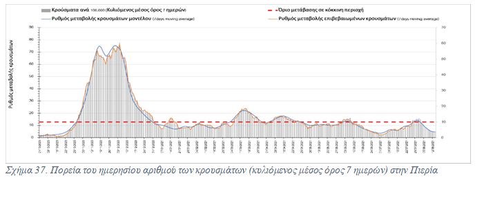 Σχήμα 37. Πορεία του ημερησίου αριθμού των κρουσμάτων (κυλιόμενος μέσος όρος 7 ημερών) στην Πιερία