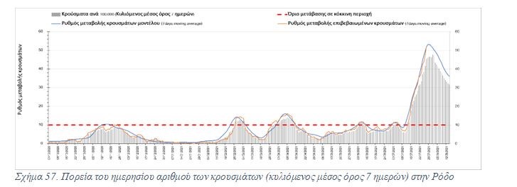 Σχήμα 57. Πορεία του ημερησίου αριθμού των κρουσμάτων (κυλιόμενος μέσος όρος 7 ημερών) στην Ρόδο Συμπεράσματα:Με βάση τα αποτελέσματα της Τρίτης, είχαμε ελαφρά μικρότερο αριθμό ασθενών σε κρίσιμη κατάσταση (διασωληνωμένοι σε ΜΕΘ) σε σχέση με τη Δευτέρα, ενώ και ο αριθμός των θανάτων ήταν σταθεροποιημένος σε σχετικά χαμηλά νούμερα. Οι προβλέψεις αυτές συνάδουν με τις προσομοιώσεις του μοντέλου CORE, όπως και ο αριθμός των κρουσμάτων, ο οποίος πλέον παρουσιάζει έντονη επιβράδυνση (έως και σταθεροποίηση) της ανοδικής πορείας. Σε πανελλαδικό επίπεδο ο κυλιόμενος εβδομαδιαίος μέσος όρος του δείκτη θετικότητας διαμορφώθηκε στο 3,4% (η ημερήσια τιμή είναι 3,7%) ενώ ο κυλιόμενος εβδομαδιαίος μέσος όρος του πραγματικού αριθμού αναπαραγωγής Rt (δηλαδή ο αριθμός των ατόμων που ένας φορέας μπορεί να επιμολύνει) διαμορφώθηκε στο 1,03 (τιμές του Rt πάνω από τη μονάδα υποδηλώνουν αύξηση της διασποράς του ιού στην κοινότητα). Συνολικά η πορεία της πανδημίας είναι αυξητική από τις 28/6 κι έπειτα, όπως αντικατοπτρίζεται και από τον ημερήσιο αριθμό των κρουσμάτων (κυλιόμενος μέσος όρος 7 ημερών), ο οποίος πλέον ξεπέρασε τα 2500 (2588). Αυτό συνέβη, γιατί η μεγαλύτερη από τη φαινομενική διασπορά των μεταλλάξεων και τα υπάρχοντα ανοίγματα σε συνδυασμό με φαινόμενα αδικαιολόγητης συρροής, έχουν υπερβεί τη δυναμική μείωσης της διασποράς λόγω της ανόδου της θερμοκρασίας και της επαγόμενης πτώσης της μεταδοτικότητας, του μεγάλου αριθμού των self-test (που όμως είναι λίγο μικρότερος σε σχέση με τις πρώτες εβδομάδες) και της προόδου των εμβολιασμών. Η επιδημιολογική εικόνα την Τρίτη σε σχέση με την προηγούμενη Τρίτη, παρουσιάζεται στα συγκριτικά συγκεντρωτικά αποτελέσματα που δίνονται στο Σχήμα 58. Αξίζει να σημειωθεί ότι η τιμή αυτή του Rt (1,03) είναι υψηλή για την εποχή, και δε δικαιολογείται μόνο από την παρουσία μεταλλάξεων, αλλά συνδέεται και με φαινόμενα συρροής τα οποία παρατηρούνται κυρίως στην Αττική και σε τουριστικούς προορισμούς. Στην πράξη δηλαδή, λόγω της αυξημένης μεταδοτικότητας των νέων στελεχών, τα φαινόμενα συρροής αποδεικνύονται πολύ πιο επιβαρυντικά για τη διασπορά της νόσου στην κοινότητα. Αυτό πρέπει να το λάβουμε υπόψη για τη συνέχεια της θερινής περιόδου και τη διαχείριση θρησκευτικών και άλλων παραδοσιακών ή τουριστικών εκδηλώσεων όπου μπορούν να συμβούν φαινόμενα συρροής. Αξίζει να σημειωθεί ότι και παρατηρείται σημαντική μείωση του Rt και επιβεβαιώνεται η επιβράδυνση της ανόδου, καθώς και η αλλαγή της τάσης στην Αττική σε ελαφρά πτωτική, την οποία είχαμε διαβλέψει, ενώ πλέον και άλλες περιοχές, παρά το μεγάλο ύψος του 4ου κύματος το οποίο διένυσαν (όπως τα Γιάννενα, η Πρέβεζα, η Καρδίτσα, η Μύκονος), πλέον βρίσκονται σε τροχιά αποκλιμάκωσης. Συνεπώς αναμένουμε την πορεία των κρουσμάτων και τις επόμενες ημέρες για να δούμε σε ποιο βαθμό η έντονη άνοδος οφείλεται σε παροδικά φαινόμενα συρροών, ο έλεγχος των οποίων, οδήγησε στην επιβράδυνση της ανοδικής πορείας. Αξίζει να σημειωθεί, ότι δεν υπάρχει χώρος για εφησυχασμό, γιατί τα φαινόμενα αυτά συρροής και η αύξηση των κρουσμάτων, επέτρεψαν την μεγαλύτερη διασπορά στην κοινότητα των μεταλλαγμένων στελεχών, γεγονός που αναμένεται να δυσκολέψει την διαχείριση της πανδημίας κατά τη διάρκεια των αμέσως επόμενων εβδομάδων, ιδιαίτερα εάν παρατηρηθούν παρόμοια φαινόμενα ανεξέλεκτων συρροών. Αξίζει να ση
