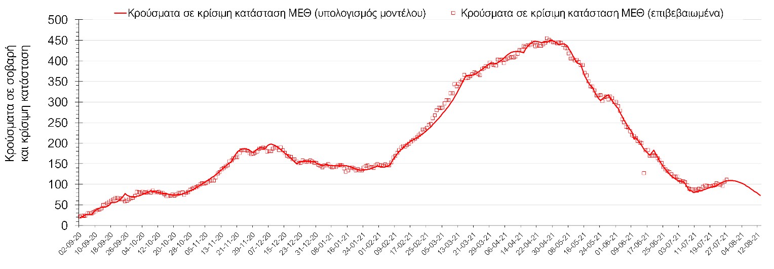 Ακολουθεί η ανάλυση του καθηγητή Δημοσθένη Σαρηγιάννη και της ομάδας του για την εξέλιξη της πανδημίας στη χώρα μας:Σύμφωνα με τα στοιχεία του ΕΟΔΥ για την Τρίτη, ο σημερινός αριθμός κρουσμάτων ανέρχεται στα 3593 νέα κρούσματα, με τα αποτελέσματα να συνάδουν με τις προβλέψεις της υπολογιστικής πλατφόρμας CORE (n=3591), που λαμβάνουν υπόψη την διασπορά όλων των μεταλλαγμένων στελεχών του SARS-CoV-2. Ο αριθμός των τεστ που πραγματοποιήθηκαν ήταν 97664 και σε συνδυασμό με τον αριθμό των κρουσμάτων, ο δείκτης θετικότητας διαμορφώθηκε στο 3,7%. Η πραγματοποίηση αριθμού τεστ σε επίπεδα άνω των 50.000 την ημέρα, συντελεί στο να εξάγουμε πιο ασφαλή συμπεράσματα σχετικά με την πορεία της πανδημίας, αλλά και να εντοπίζονται περισσότεροι ασυμπτωματικοί και προσυμπτωματικοί, συντελώντας στην ανάσχεση πιθανής έξαρσης που θα μπορούσε να συμβεί λόγω της εμφάνισης ολοένα και ταχύτερα μεταδιδόμενων στελεχών, σε συνδυασμό με τα υπάρχοντα ανοίγματα και τις τουριστικές ροές. Σημαντικοί σύμμαχοι σε αυτή την προσπάθεια αύξησης του αριθμού των τεστ ανίχνευσης του SARS-CoV-2 αποτελούν εκτός από τα rapid test και τα self test, για να καταπολεμηθεί η δυναμική αύξησης της διασποράς στις περιοχές όπου μια τέτοια αύξηση διαφαίνεται από τα μέχρι τώρα δεδομένα και την υπολογιστική πλατφόρμα CORE, αλλά και για να συνεχιστεί η πολύ καλή πορεία στο σύνολο της χώρας.Ο αριθμός ημερήσιων θανάτων (8) που καταγράφηκε είναι μεγαλύτερος από τη Δευτέρα (5). Όπως είχαμε προβλέψει ο κυλιόμενος εβδομαδιαίος μέσος όρος που είναι 6 παραμένει σε χαμηλά επίπεδα, αλλά από την επόμενη εβδομάδα αναμένεται να ακολουθήσει την ανοδική τάση των ασθενών σε κρίσιμη κατάσταση. Όσον αφορά στους ασθενείς σε κρίσιμη κατάσταση (διασωληνωμένοι σε ΜΕΘ), ο αριθμός είναι μειωμένος σε σχέση με τη Δευτέρα (142 από 147), και πλέον βλέπουμε την επιβράδυνση της πτώσης να οδηγεί προς την αναμενόμενη αναστροφή της πτωτικής πορείας να συμβαίνει την χρονική στιγμή που αναμέναμε. Η καμπύλη εξέλιξης του αριθμού των ασθενών που νοσηλεύονται σε κλίνες ΜΕΘ με βάση τις προσομοιώσεις της πλατφόρμας CORE, όπως αυτή παρουσιάζεται στο Σχήμα 1, των ασθενών που νοσηλεύονται σε απλές κλίνες στο Σχήμα 2 (όπου διαφαίνεται πλέον η αναμενόμενη αύξηση στις νοσηλείες), ενώ μια εκτίμηση για την πορεία των θανάτων ανά ημέρα παρουσιάζεται στο Σχήμα 3.