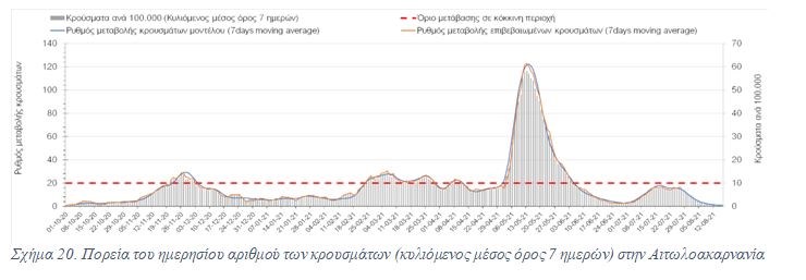 Σχήμα 20. Πορεία του ημερησίου αριθμού των κρουσμάτων (κυλιόμενος μέσος όρος 7 ημερών) στην Αιτωλοακαρνανία