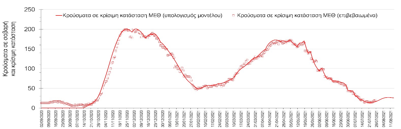 Σχήμα 1. Αριθμός κρουσμάτων σε κρίσιμη κατάσταση (ΜΕΘ) σύμφωνα με τα στοιχεία του ΕΟΔΥ και τις προβλέψεις της υπολογιστικής πλατφόρμας CORE.