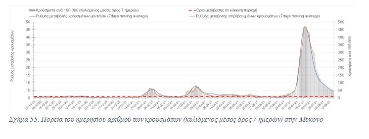 Σχήμα 55. Πορεία του ημερησίου αριθμού των κρουσμάτων (κυλιόμενος μέσος όρος 7 ημερών) στην Μύκονο