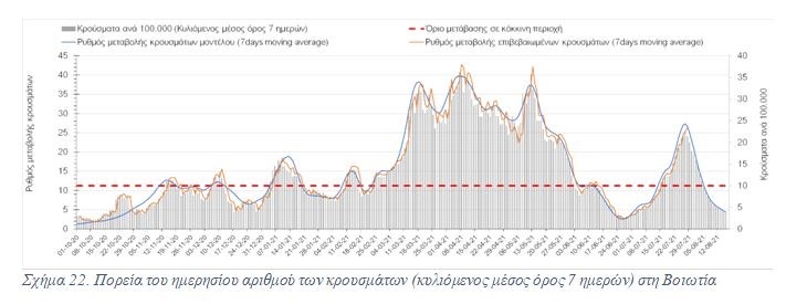 Σχήμα 22. Πορεία του ημερησίου αριθμού των κρουσμάτων (κυλιόμενος μέσος όρος 7 ημερών) στη Βοιωτία