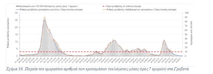 Σχήμα 38. Πορεία του ημερησίου αριθμού των κρουσμάτων (κυλιόμενος μέσος όρος 7 ημερών) στα Γρεβενά