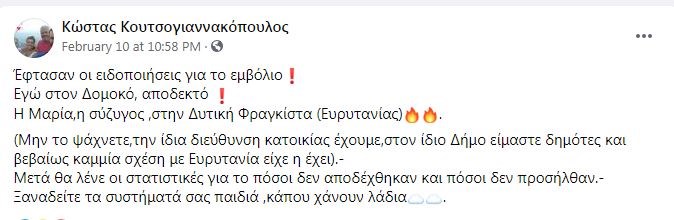 «Όσες φορές και αν προσπαθήσαμε το αποτέλεσμα είναι το ίδιο. Κατοικούμε στην οδό Αχαιών στη Λαμία και ο ταχυδρομικός κώδικας είναι 35131. Και ενώ το ραντεβού της συζύγου κλείστηκε για το Κ.Υ Στυλίδας, στέλνουν τον σύζυγο στη Λευκάδα», ανέφερε το ζευγάρι. «Ώρες τώρα προσπαθούμε να βγάλουμε άκρη, αλλά δυστυχώς κανείς δεν μπορεί να δώσει απάντηση. Απευθυνθήκαμε στον γιατρό, στο φαρμακείο, στο Νοσοκομείο Λαμίας, στον Δήμο, στο Κέντρο Εμβολιασμών του ΕΟΔΥ, χωρίς αποτέλεσμα», συμπλήρωσαν.