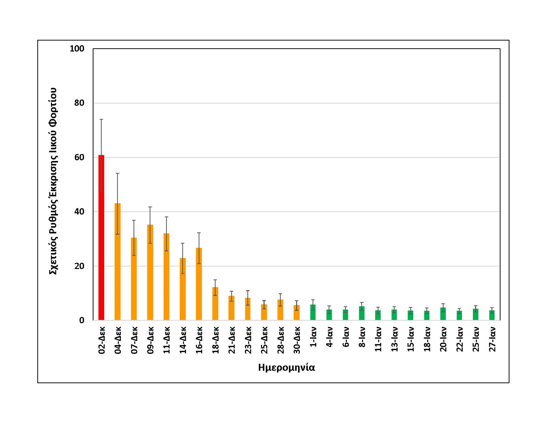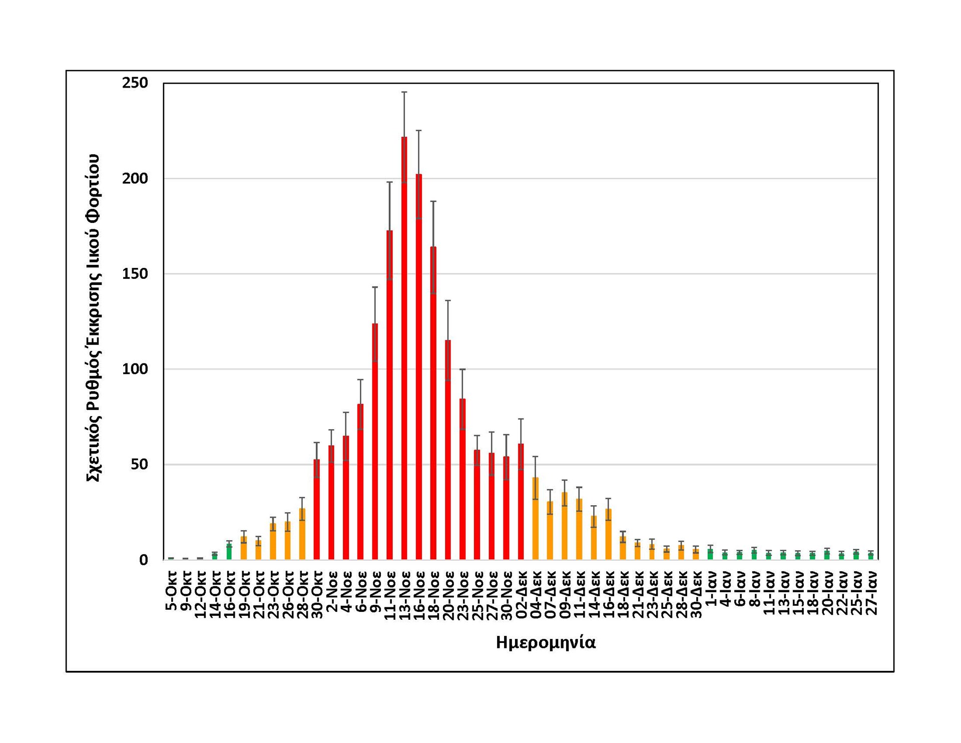 Στο παρακάτω διάγραμμα, οι ημέρες των δειγματοληψιών που καταγράφονται με κόκκινο χρώμα αντιστοιχούν σε περισσότερα από 500 κρούσματα – όπως ανακοινώθηκαν τις αντίστοιχες ημέρες από τον ΕΟΔΥ – οι μέρες που καταγράφονται με πορτοκαλί σε 100-400 κρούσματα και οι μέρες που καταγράφονται με πράσινο σε λιγότερα από εκατό κρούσματα.