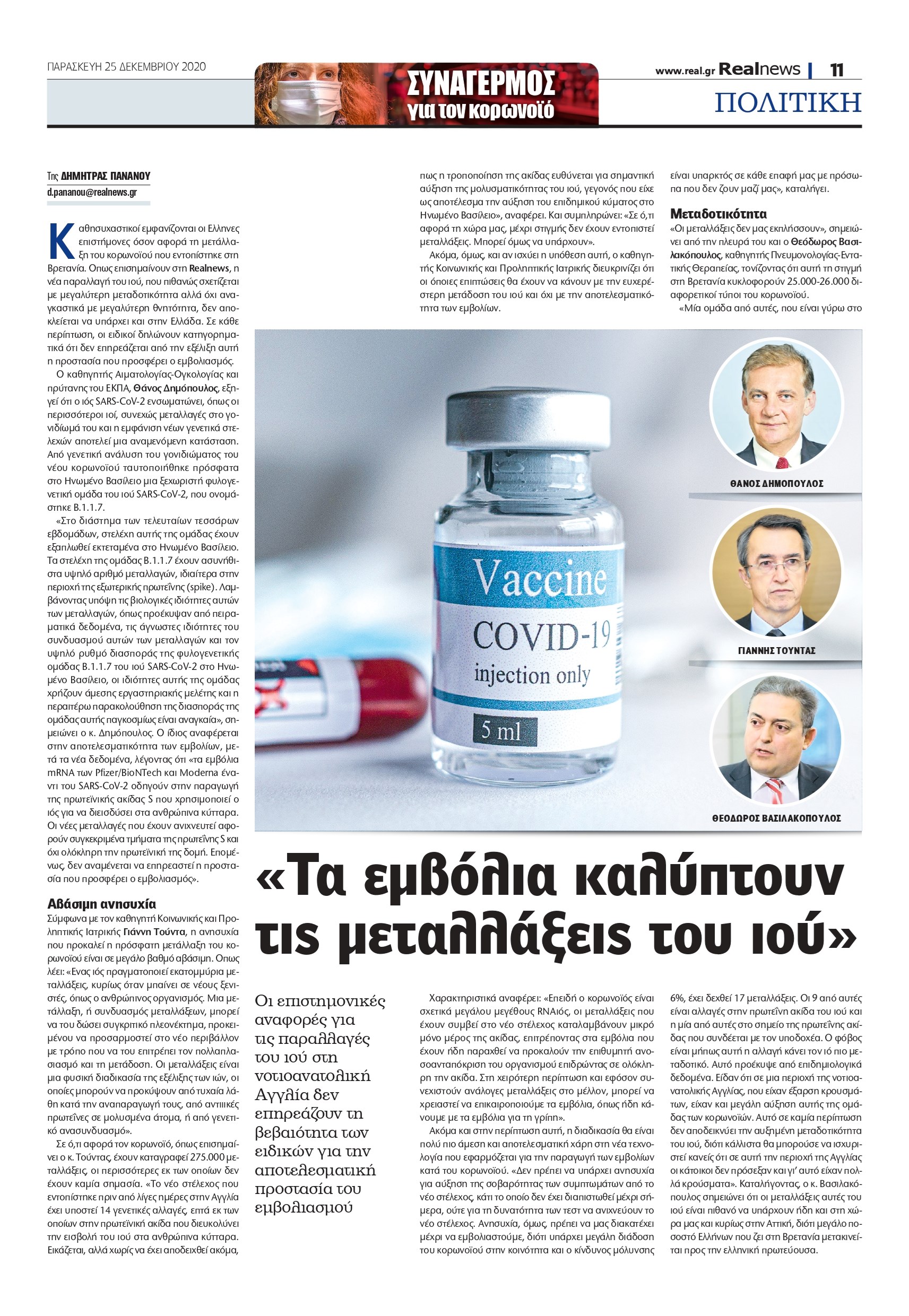 Χαρακτηριστικά αναφέρει: «Επειδή ο κορoνοϊός είναι σχετικά μεγάλου μεγέθους RNAιός, οι μεταλλάξεις που έχουν συμβεί στο νέο στέλεχος καταλαμβάνουν μικρό μόνο μέρος της ακίδας, επιτρέποντας στα εμβόλια που έχουν ήδη παραχθεί να προκαλούν την επιθυμητή ανοσοανταπόκριση του οργανισμού επιδρώντας σε ολόκληρη την ακίδα. Στη χειρότερη περίπτωση και εφόσον συνεχιστούν ανάλογες μεταλλάξεις στο μέλλον, μπορεί να χρειαστεί να επικαιροποιούμε τα εμβόλια, όπως ήδη κάνουμε με τα εμβόλια για τη γρίπη». «Οι μεταλλάξεις δεν μας εκπλήσσουν», σημειώνει από την πλευρά του και ο Θεόδωρος Βασιλακόπουλος, καθηγητής Πνευμονολογίας-Εντατικής Θεραπείας, τονίζοντας ότι αυτή τη στιγμή στη Βρετανία κυκλοφορούν 25.000-26.000 διαφορετικοί τύποι του κορoνοϊού.