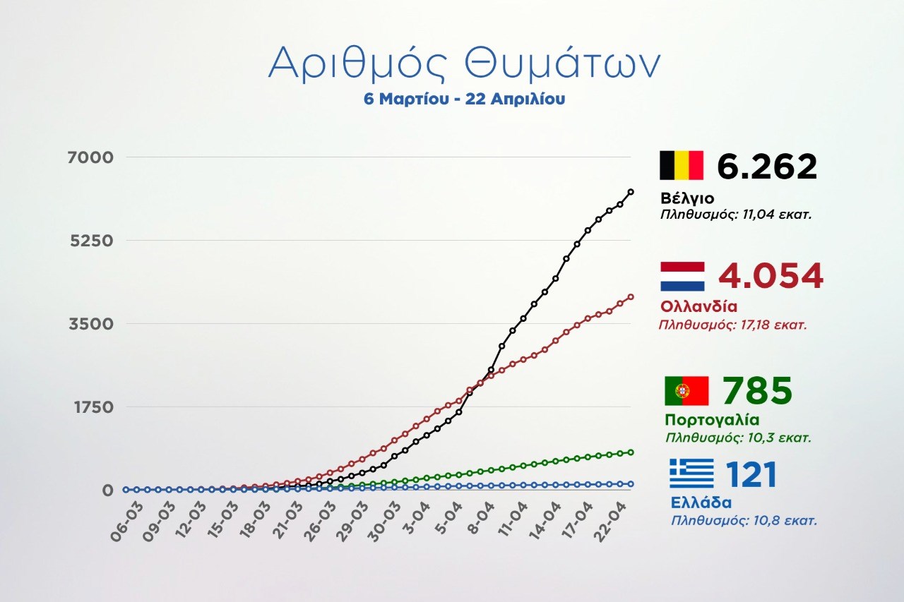 Την πολύ καλύτερη εικόνα που παρουσιάζει η Ελλάδα συγκριτικά με χώρες με παρόμοια πληθυσμιακά δεδομένα, όπως η Ολλανδία, το Βέλγιο και η Πορτογαλία, παρουσίασε σε γραφήματα, τα οποία δείχνουν τον αριθμό θανάτων και κρουσμάτων από τον κορονοϊό, ο κυβερνητικός εκπρόσωπος Στέλιος Πέτσας.