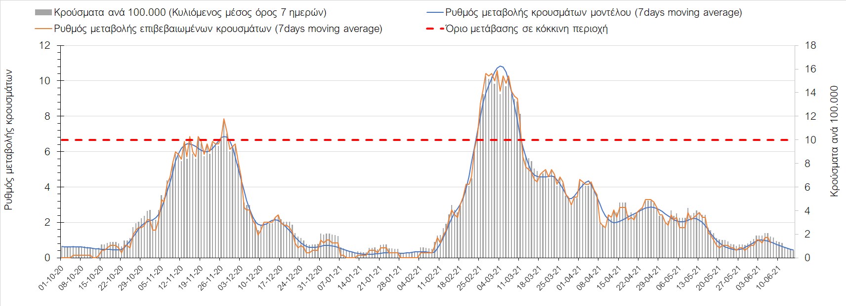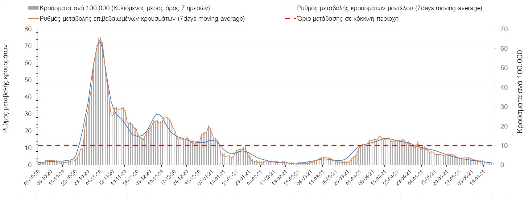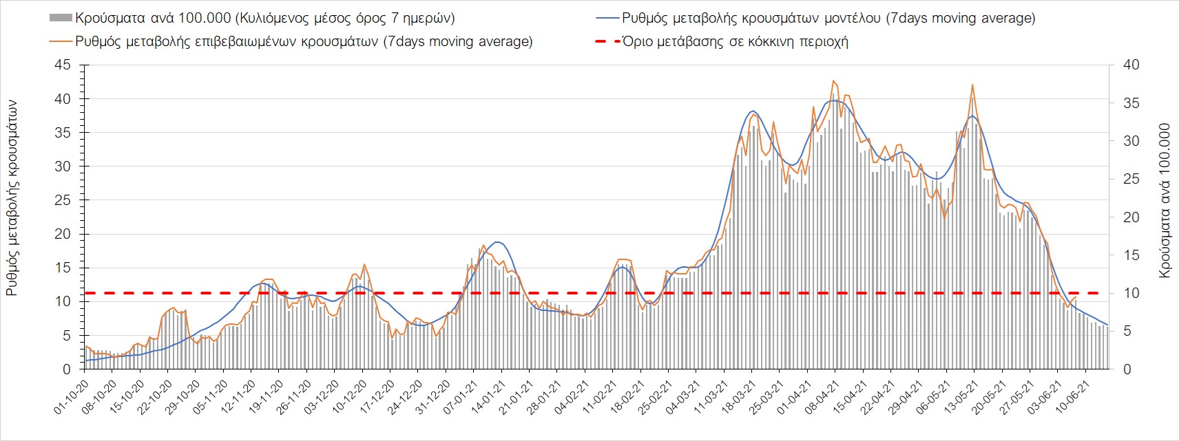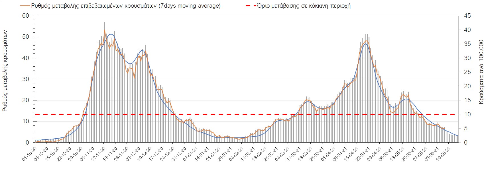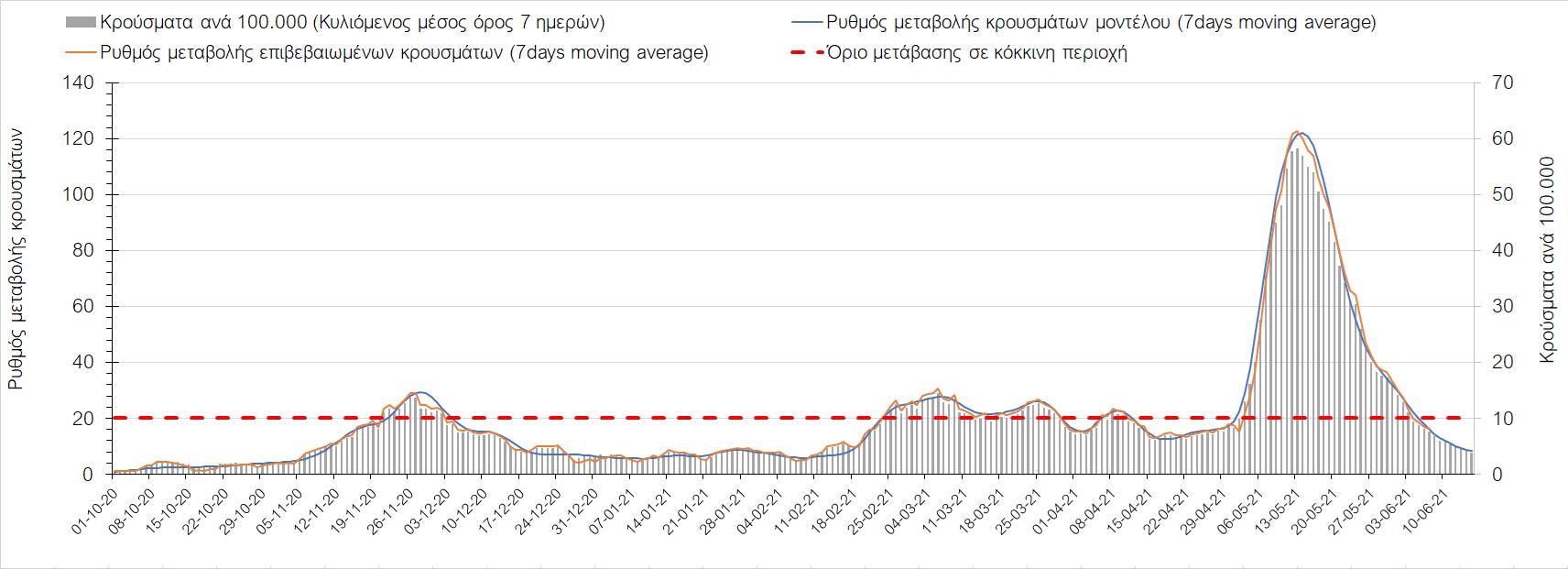 Σχήμα 44. Πορεία του ημερησίου αριθμού των κρουσμάτων (κυλιόμενος μέσος όρος 7 ημερών) στον ΈβροΣτο Ηράκλειο, όπου εντοπίστηκαν 13 κρούσματα παρατηρείται αύξηση σε σχέση με προχθές (Σχήμα 45). Λόγω των έντονων διακυμάνσεων που σημειώθηκαν στην πορεία της πανδημίας ως αποτέλεσμα του πολύ μεγάλου αριθμού φορέων του μεταλλαγμένου στελέχους Β.1.1.7, το Ηράκλειο είχε μεγάλη διασπορά του ιού και αυτή η δυναμική καθυστέρησε τον αποχαρακτηρισμό της περιοχής ως κόκκινη, υπό του όριο της οποίας βρίσκεται τώρα, και αναμένεται να συνεχιστεί η πτωτική πορεία. Στα Χανιά με 16 κρούσματα (Σχήμα 46) έχουμε αύξηση σε σχέση με προχθές. Τα Χανιά θα παραμείνουν ανάμεσα στις κόκκινες περιοχές και μετά τις 10 Ιουνίου, όμως πλέον έχει διαμορφωθεί σταθεροποιημένη τάση αποκλιμάκωσης, η οποία εάν δεν ανακοπεί, θα οδηγήσει την περιοχή στο όριο αποχαρακτηρισμού από κόκκινη στις επόμενες 4-5 ημέρες. Ίδιος αριθμός κρουσμάτων παρατηρείται στο Ρέθυμνο με 8 κρούσματα, στο οποίο η προ 15 ημερών ανοδική τάση, οδεύει σε πτωτική πορεία (Σχήμα 47), και όπως είχαμε προβλέψει, η περιοχή πέρασε υπό του ορίου χαρακτηρισμού ως κόκκινη. Στο Λασίθι παρατηρείται σταθεροποίηση σε σχέση με προχθές, καθώς εντοπίστηκαν 0 κρούσματα και παρόλο που παρατηρούνται έντονες διακυμάνσεις (Σχήμα 48), η περιφερειακή ενότητα βρίσκεται κάτω από το όριο της κόκκινης περιοχής.