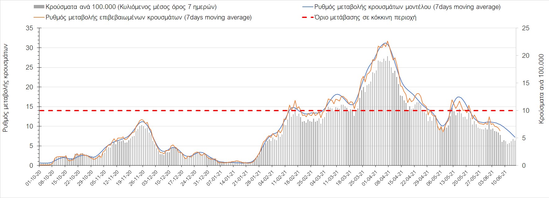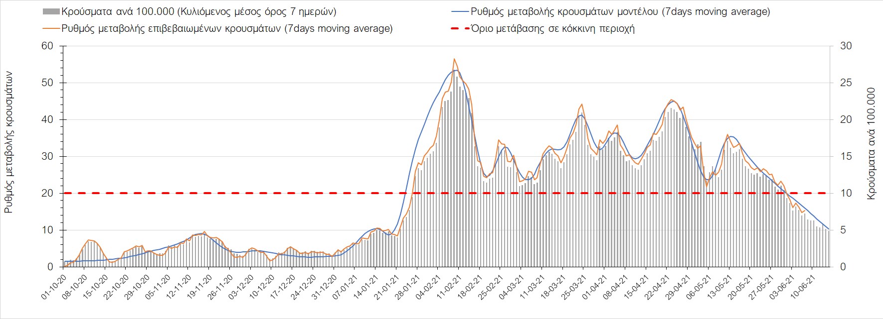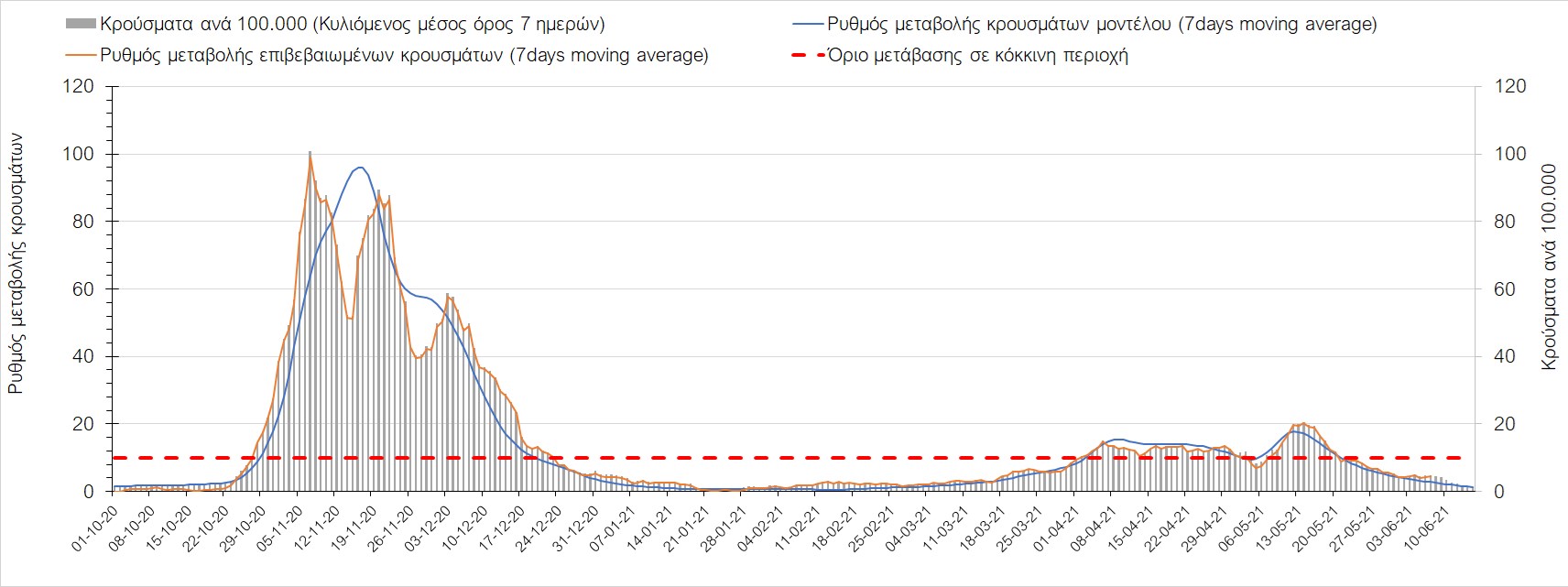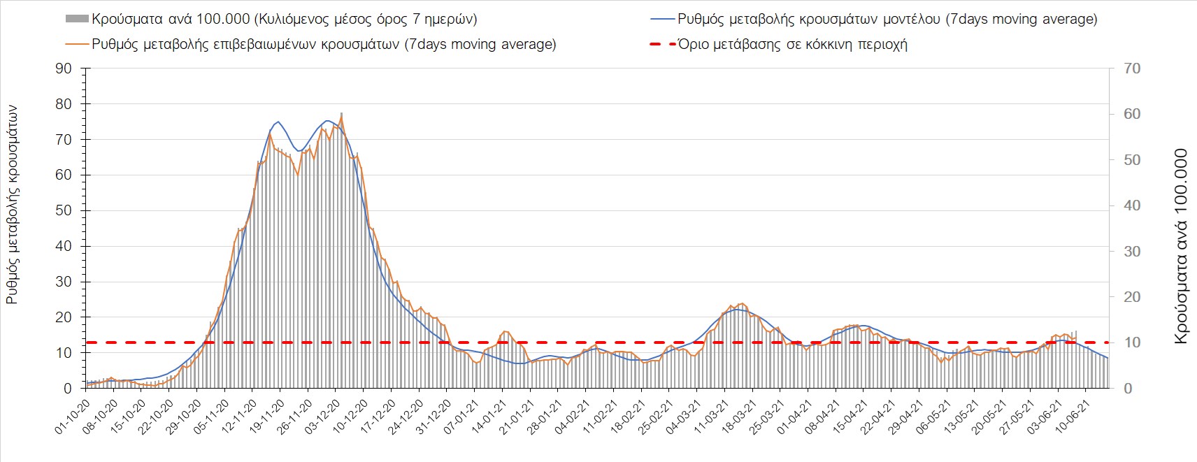 Σχήμα 44. Πορεία του ημερησίου αριθμού των κρουσμάτων (κυλιόμενος μέσος όρος 7 ημερών) στον ΈβροΣτο Ηράκλειο, όπου εντοπίστηκαν 13 κρούσματα παρατηρείται αύξηση σε σχέση με προχθές (Σχήμα 45). Λόγω των έντονων διακυμάνσεων που σημειώθηκαν στην πορεία της πανδημίας ως αποτέλεσμα του πολύ μεγάλου αριθμού φορέων του μεταλλαγμένου στελέχους Β.1.1.7, το Ηράκλειο είχε μεγάλη διασπορά του ιού και αυτή η δυναμική καθυστέρησε τον αποχαρακτηρισμό της περιοχής ως κόκκινη, υπό του όριο της οποίας βρίσκεται τώρα, και αναμένεται να συνεχιστεί η πτωτική πορεία. Στα Χανιά με 16 κρούσματα (Σχήμα 46) έχουμε αύξηση σε σχέση με προχθές. Τα Χανιά θα παραμείνουν ανάμεσα στις κόκκινες περιοχές και μετά τις 10 Ιουνίου, όμως πλέον έχει διαμορφωθεί σταθεροποιημένη τάση αποκλιμάκωσης, η οποία εάν δεν ανακοπεί, θα οδηγήσει την περιοχή στο όριο αποχαρακτηρισμού από κόκκινη στις επόμενες 4-5 ημέρες. Ίδιος αριθμός κρουσμάτων παρατηρείται στο Ρέθυμνο με 8 κρούσματα, στο οποίο η προ 15 ημερών ανοδική τάση, οδεύει σε πτωτική πορεία (Σχήμα 47), και όπως είχαμε προβλέψει, η περιοχή πέρασε υπό του ορίου χαρακτηρισμού ως κόκκινη. Στο Λασίθι παρατηρείται σταθεροποίηση σε σχέση με προχθές, καθώς εντοπίστηκαν 0 κρούσματα και παρόλο που παρατηρούνται έντονες διακυμάνσεις (Σχήμα 48), η περιφερειακή ενότητα βρίσκεται κάτω από το όριο της κόκκινης περιοχής.
