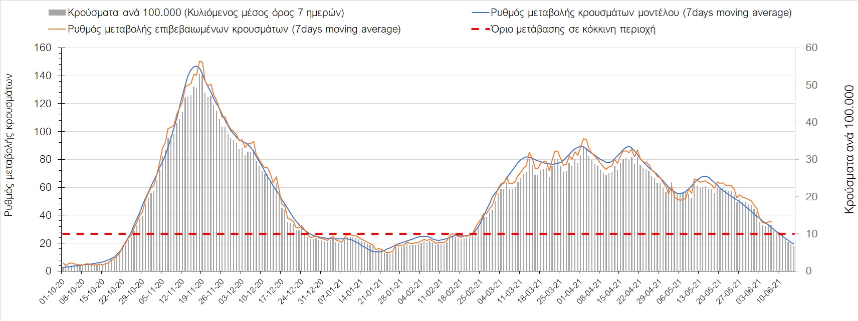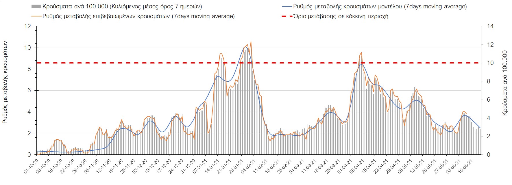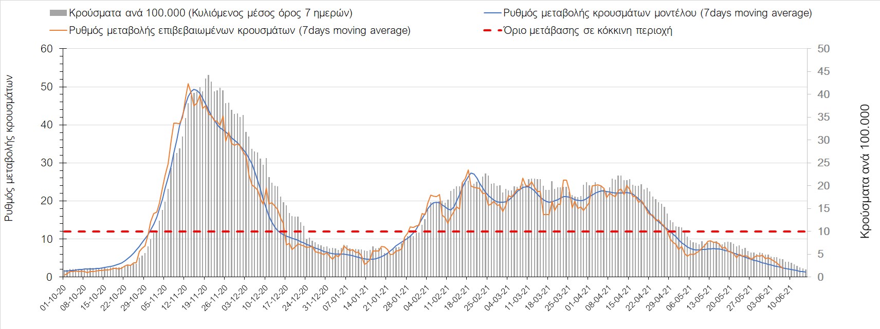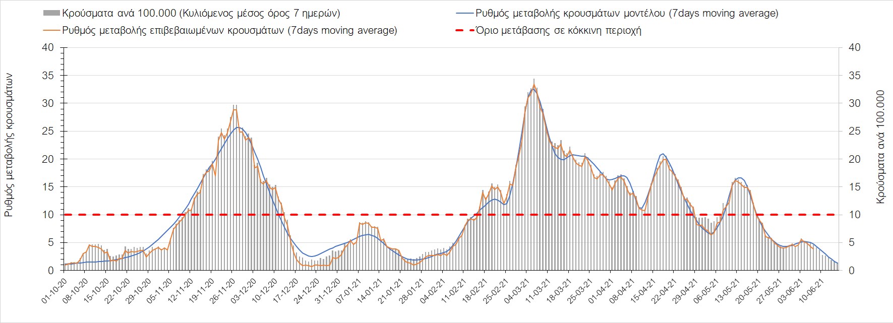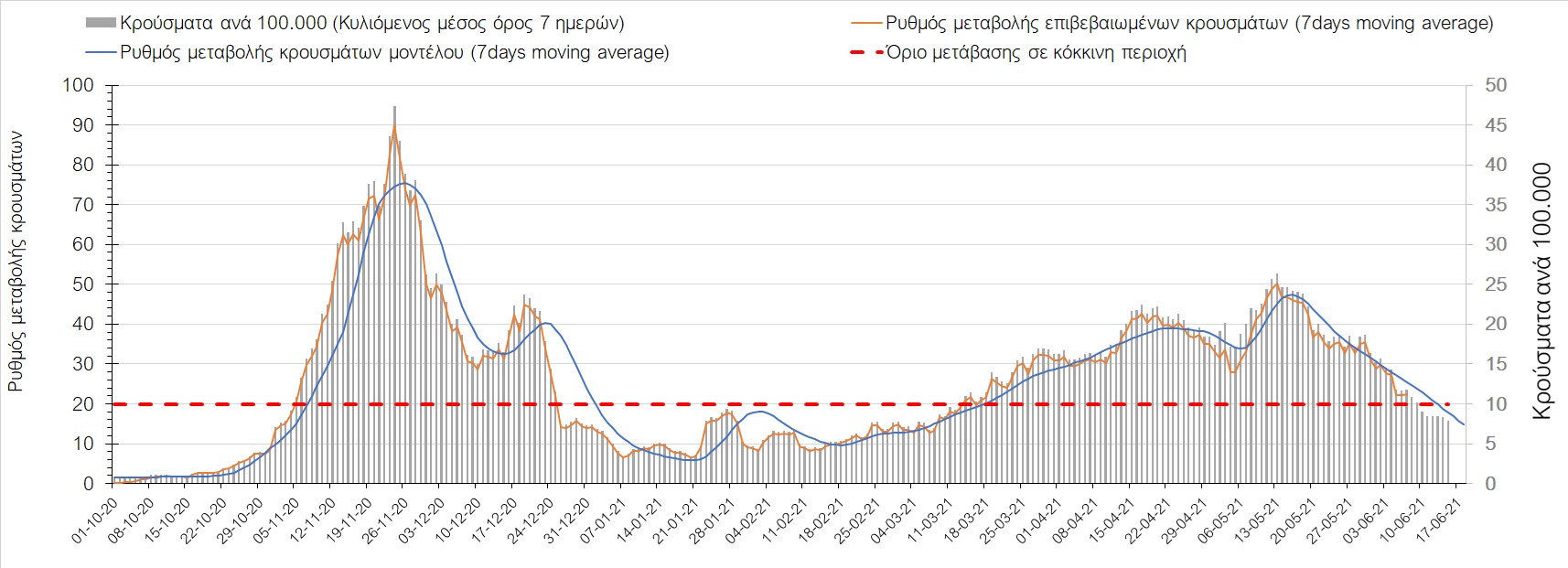 Σχήμα 44. Πορεία του ημερησίου αριθμού των κρουσμάτων (κυλιόμενος μέσος όρος 7 ημερών) στον ΈβροΣτο Ηράκλειο, όπου εντοπίστηκαν 13 κρούσματα παρατηρείται αύξηση σε σχέση με προχθές (Σχήμα 45). Λόγω των έντονων διακυμάνσεων που σημειώθηκαν στην πορεία της πανδημίας ως αποτέλεσμα του πολύ μεγάλου αριθμού φορέων του μεταλλαγμένου στελέχους Β.1.1.7, το Ηράκλειο είχε μεγάλη διασπορά του ιού και αυτή η δυναμική καθυστέρησε τον αποχαρακτηρισμό της περιοχής ως κόκκινη, υπό του όριο της οποίας βρίσκεται τώρα, και αναμένεται να συνεχιστεί η πτωτική πορεία. Στα Χανιά με 16 κρούσματα (Σχήμα 46) έχουμε αύξηση σε σχέση με προχθές. Τα Χανιά θα παραμείνουν ανάμεσα στις κόκκινες περιοχές και μετά τις 10 Ιουνίου, όμως πλέον έχει διαμορφωθεί σταθεροποιημένη τάση αποκλιμάκωσης, η οποία εάν δεν ανακοπεί, θα οδηγήσει την περιοχή στο όριο αποχαρακτηρισμού από κόκκινη στις επόμενες 4-5 ημέρες. Ίδιος αριθμός κρουσμάτων παρατηρείται στο Ρέθυμνο με 8 κρούσματα, στο οποίο η προ 15 ημερών ανοδική τάση, οδεύει σε πτωτική πορεία (Σχήμα 47), και όπως είχαμε προβλέψει, η περιοχή πέρασε υπό του ορίου χαρακτηρισμού ως κόκκινη. Στο Λασίθι παρατηρείται σταθεροποίηση σε σχέση με προχθές, καθώς εντοπίστηκαν 0 κρούσματα και παρόλο που παρατηρούνται έντονες διακυμάνσεις (Σχήμα 48), η περιφερειακή ενότητα βρίσκεται κάτω από το όριο της κόκκινης περιοχής.