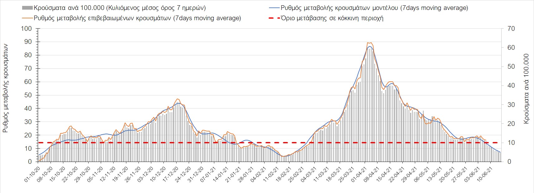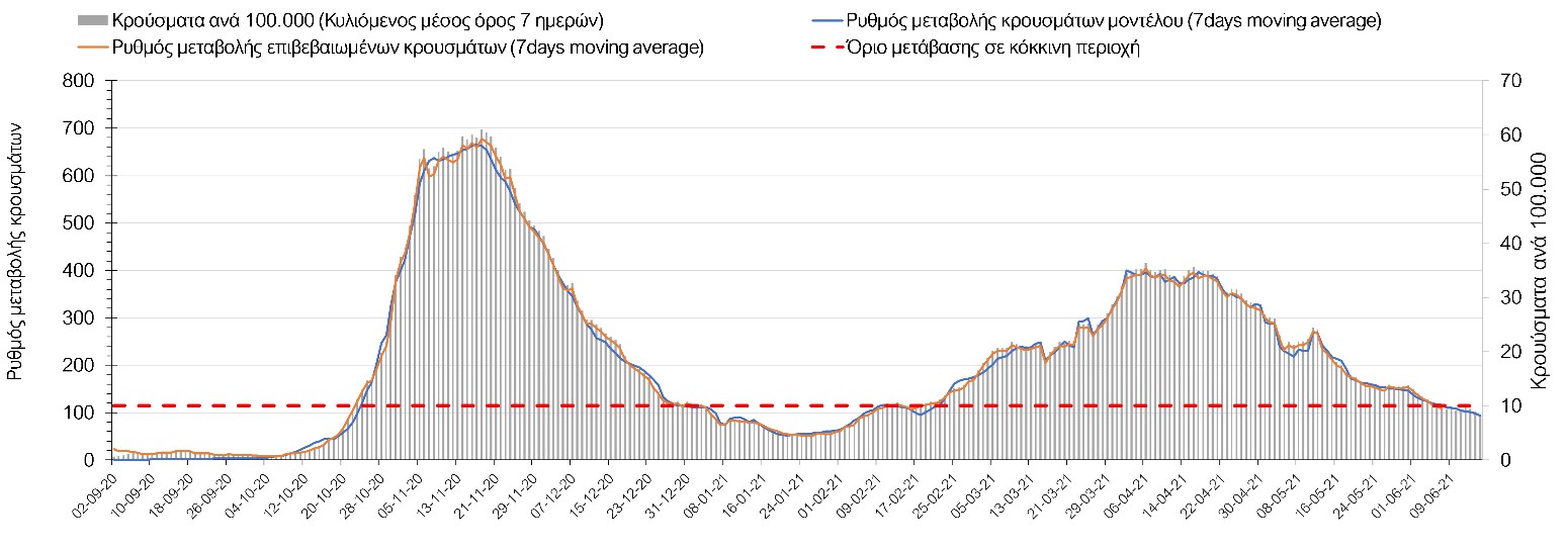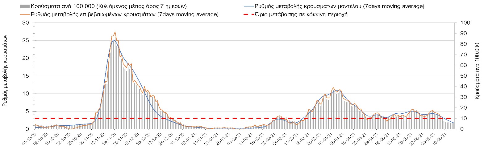 - σε μικρότερο βαθμό η πρόοδος των εμβολιασμών, η σημασία των οποίων στον έλεγχο της πανδημίας θα αρχίσει να είναι πιο εμφανής από το τέλος του Ιουνίου, λαμβάνοντας υπόψιν τη σημαντική αύξηση του ρυθμού εμβολιασμού από τα μέσα Απριλίου, με περίπου 110.000 εμβολιασμούς ημερησίως.