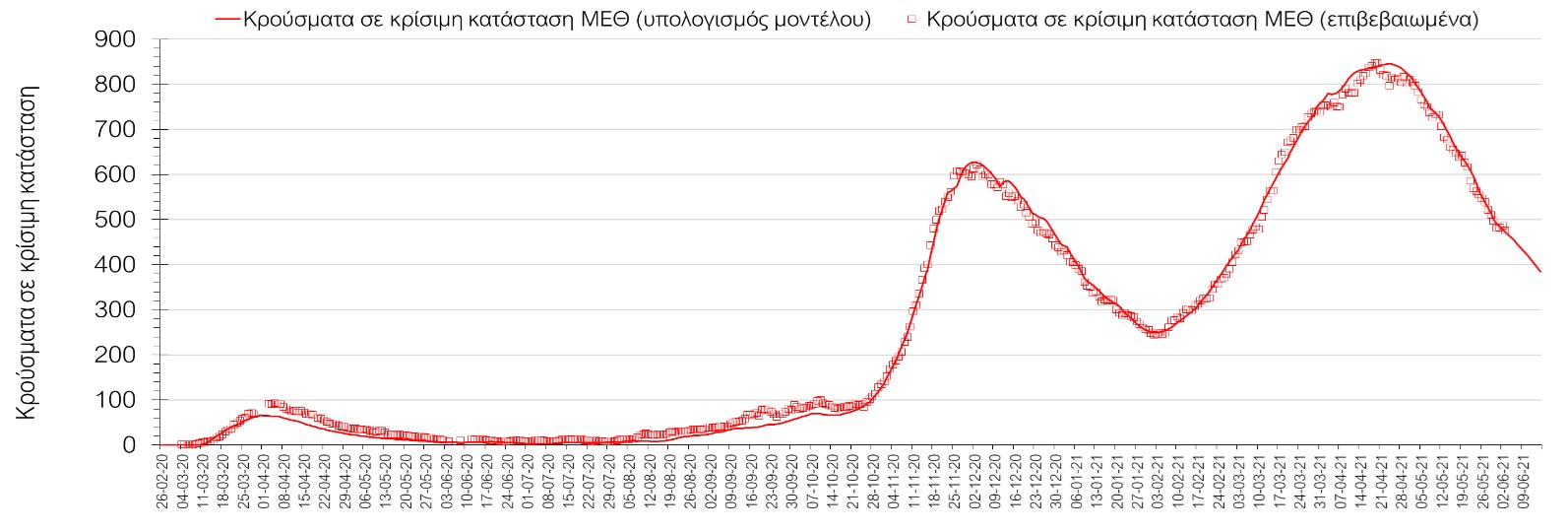 Σχήμα 1. Αριθμός κρουσμάτων σε κρίσιμη κατάσταση (ΜΕΘ) σύμφωνα με τα στοιχεία του ΕΟΔΥ και τις προβλέψεις της υπολογιστικής πλατφόρμας CORE.