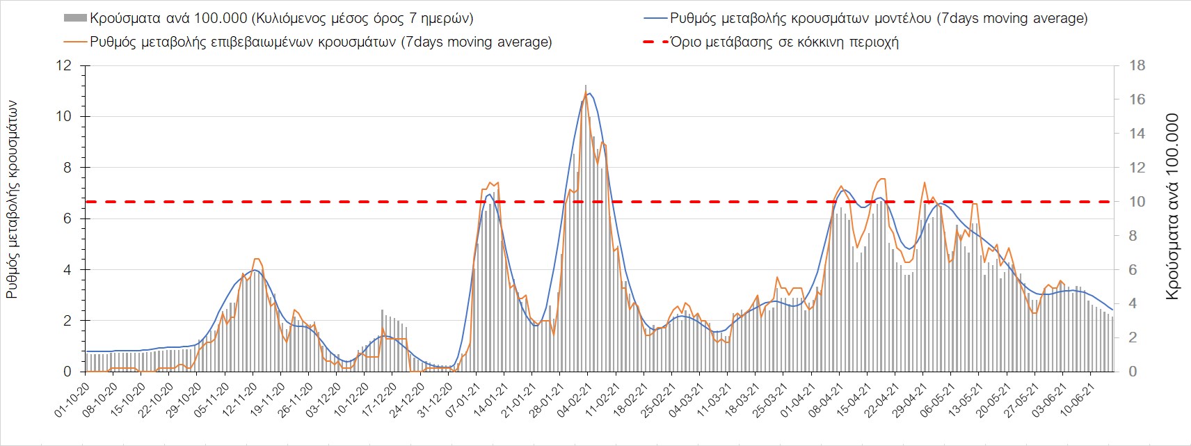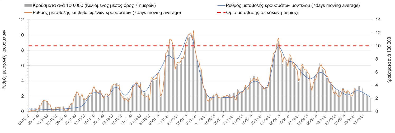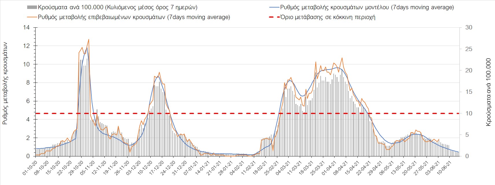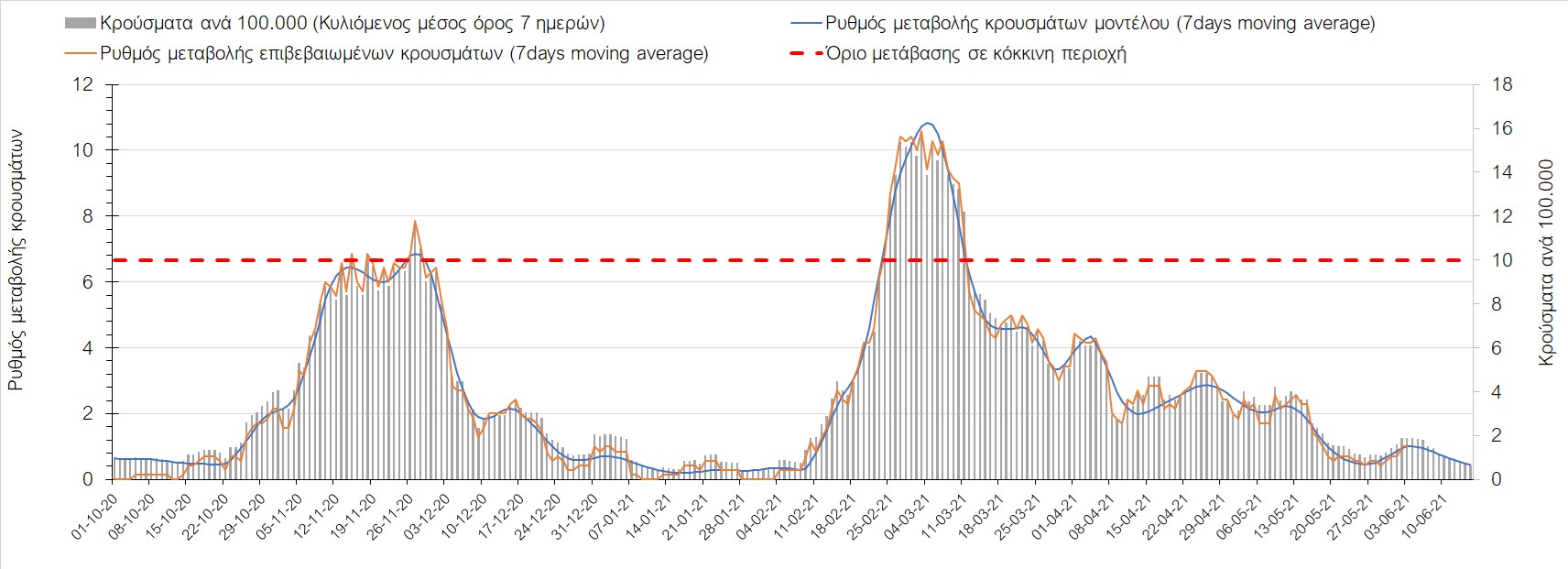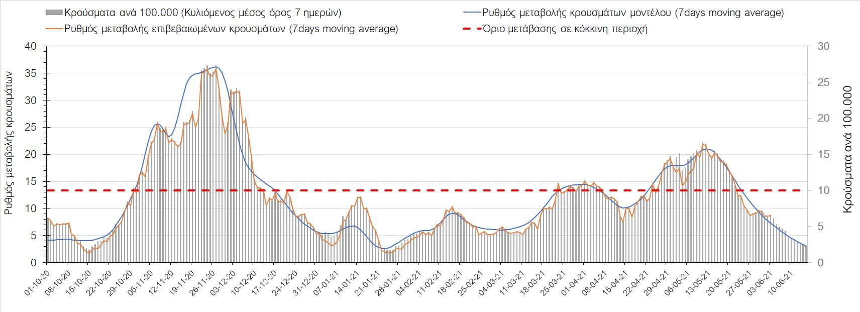 - σε μικρότερο βαθμό η πρόοδος των εμβολιασμών, η σημασία των οποίων στον έλεγχο της πανδημίας θα αρχίσει να είναι πιο εμφανής από το τέλος του Ιουνίου, λαμβάνοντας υπόψιν τη σημαντική αύξηση του ρυθμού εμβολιασμού από τα μέσα Απριλίου, με περίπου 110.000 εμβολιασμούς ημερησίως.