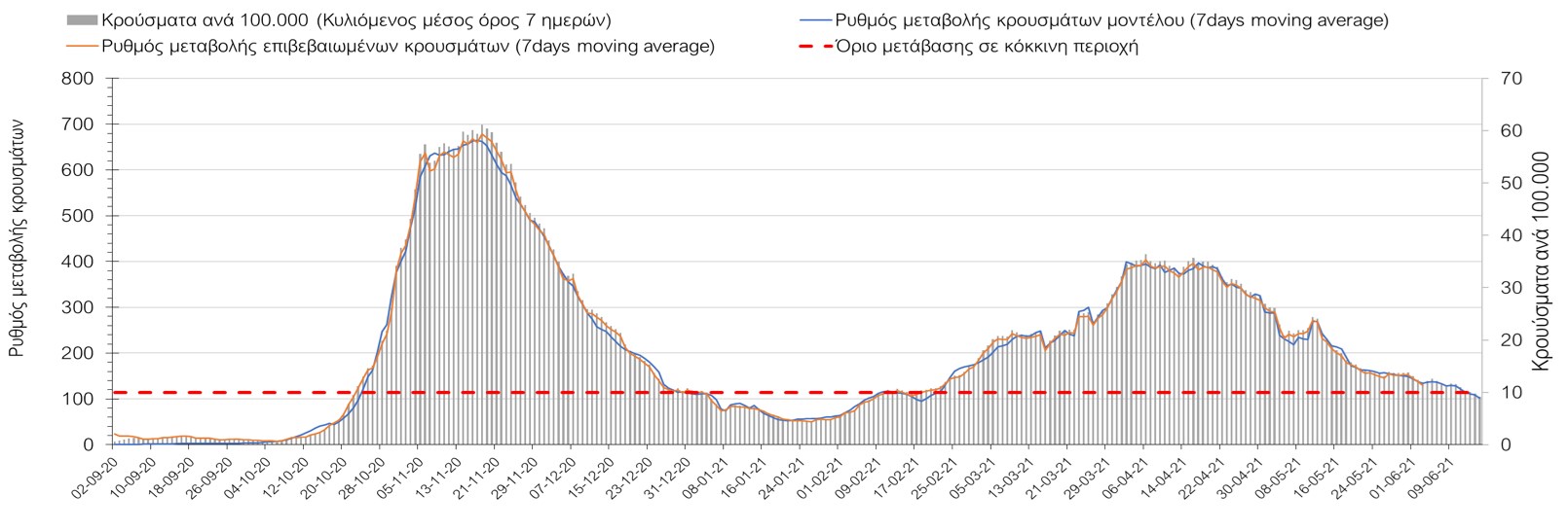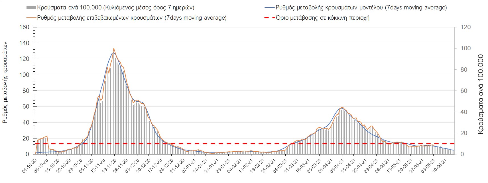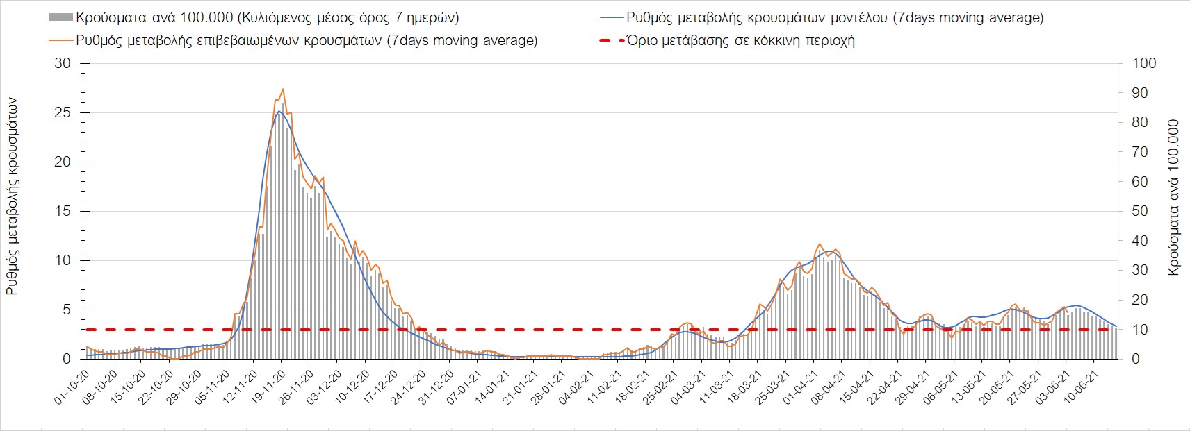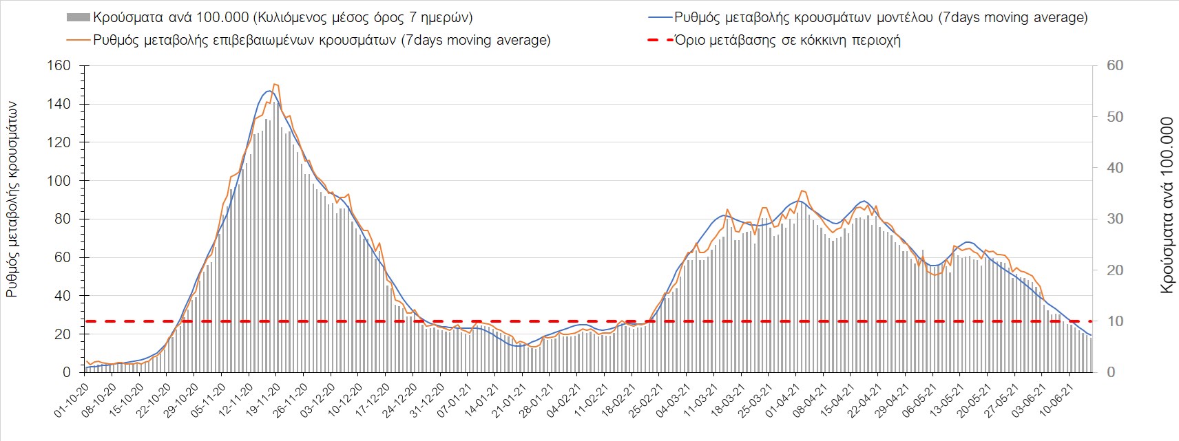 - σε μικρότερο βαθμό η πρόοδος των εμβολιασμών, η σημασία των οποίων στον έλεγχο της πανδημίας θα αρχίσει να είναι πιο εμφανής από το τέλος του Ιουνίου, λαμβάνοντας υπόψιν τη σημαντική αύξηση του ρυθμού εμβολιασμού από τα μέσα Απριλίου, με περίπου 110.000 εμβολιασμούς ημερησίως.