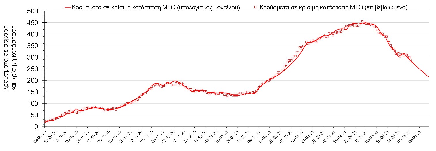 Σύμφωνα με τα στοιχεία του ΕΟΔΥ, ο αριθμός κρουσμάτων της Πέμπτης ανέρχεται στα 1239 νέα κρούσματα, με τα αποτελέσματα να συνάδουν με τις προβλέψεις της υπολογιστικής πλατφόρμας CORE (n=1234). Ο αριθμός των τεστ που πραγματοποιήθηκαν ήταν 46251 και σε συνδυασμό με τον αριθμό των κρουσμάτων, ο δείκτης θετικότητας διαμορφώθηκε στο 2,7%. Η πραγματοποίηση αριθμού τεστ σε επίπεδα άνω των 50.000 την ημέρα (όπως και πραγματοποιείται τις τελευταίες ημέρες), συντελεί στο να εξάγουμε πιο ασφαλή συμπεράσματα σχετικά με την πορεία της πανδημίας, αλλά και να εντοπίζονται περισσότεροι ασυμπτωματικοί και προσυμπτωματικοί, συντελώντας στον περιορισμό της πανδημίας. Γενικά όμως θα πρέπει να αυξηθεί κι άλλο ο αριθμός των τεστ ανίχνευσης του SARS-CoV-2 χρησιμοποιώντας τα rapid test και τα self test για να καταπολεμηθεί η δυναμική αύξησης της διασποράς στις περιοχές όπου μια τέτοια αύξηση διαφαίνεται από τα μέχρι τώρα δεδομένα και την υπολογιστική πλατφόρμα CORE, αλλά και για να συνεχιστεί η πολύ καλή πορεία στο σύνολο της χώρας.Ο αριθμός ημερήσιων θανάτων (39) που καταγράφηκε είναι αυξημένος σε σχέση με προχθές (23). Όπως είχαμε προβλέψει από την προηγούμενη εβδομάδα, ο κυλιόμενος εβδομαδιαίος μέσος όρος που είναι 33 έχει ξεκινήσει αποκλιμάκωση σε συνδυασμό με την πτωτική πορεία του αριθμού των κρουσμάτων.Όσον αφορά στους ασθενείς σε κρίσιμη κατάσταση (διασωληνωμένοι σε ΜΕΘ), ο αριθμός τους μειώθηκε σε σχέση με προχθές (476 από 486). Παρά τις παρατηρούμενες διακυμάνσεις, συνεχίζεται η αποκλιμάκωση με βάση την επικαιροποιημένη πρόβλεψη (αυτό βέβαια με την παραδοχή ότι θα συνεχίσουν να τηρούνται τα ισχύοντα μέτρα, συμπεριλαμβανομένων των προβλεπόμενων self–test και ανοίγματα δραστηριοτήτων υψηλού συγχρωτισμού, όπως τα mall και η εστίαση θα γίνουν με την κατάλληλη προετοιμασία). Αξίζει να σημειωθεί ότι ο αριθμός των ασθενών σε κρίσιμη κατάσταση όπως και των θανάτων είναι αναλογικά χαμηλότερος σε σχέση με τα αντίστοιχα μεγέθη στο δεύτερο κύμα, τόσο λόγω των εμβολιασμών ευπαθών ομάδων, όσο και του υψηλότερου αριθμού τεστ ανίχνευσης, που συντελεί στον εντοπισμό περισσότερων ασυμπτωματικών ή ήπια συμπτωματικών κρουσμάτων. Επίσης, η διασπορά των μεταλλαγμένων στελεχών που έχουν μεγαλύτερη μεταδοτικότητα από το στέλεχος του SARS-CoV-2 που κυριαρχούσε μέχρι το τέλος Φεβρουαρίου και η αυξημένη κινητικότητα του πληθυσμού έχουν μεγαλώσει το ποσοστό των νεότερων ηλικιών που μολύνονται με αποτέλεσμα η μέση ηλικία των μολύνσεων να έχει πέσει σημαντικά. Η καμπύλη εξέλιξης του αριθμού των ασθενών που νοσηλεύονται σε κλίνες ΜΕΘ με βάση τις προσομοιώσεις της πλατφόρμας CORE, όπως αυτή παρουσιάζεται στο Σχήμα 1, των ασθενών που νοσηλεύονται σε απλές κλίνες στο Σχήμα 2, ενώ μια εκτίμηση για την πορεία των θανάτων ανά ημέρα παρουσιάζεται στο Σχήμα 3. Η πτωτική πορεία σε όλους τους δείκτες θα συνεχιστεί αλλά σε ό,τι αφορά στον αριθμό εισαγωγών στα νοσοκομεία και στους θανάτους η ταχύτητα αποκλιμάκωσης θα είναι μειωμένη σε σχέση με την προηγούμενη περίοδο.
