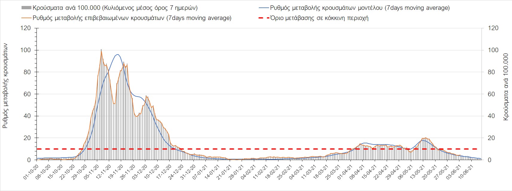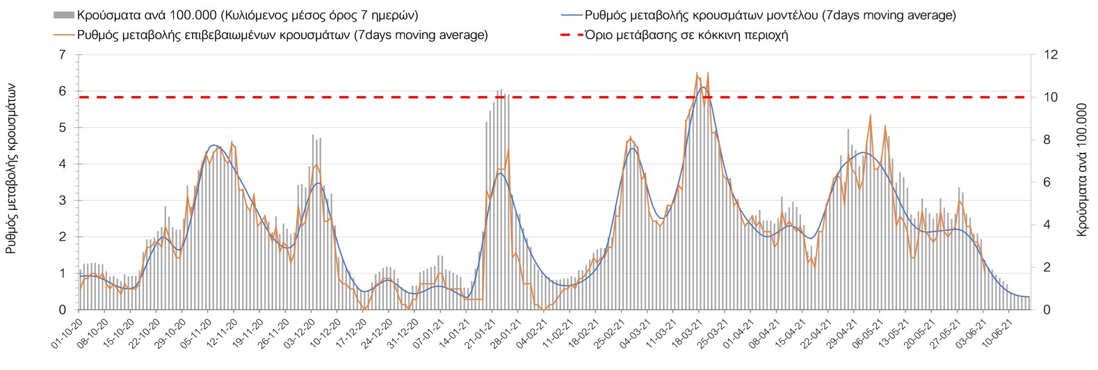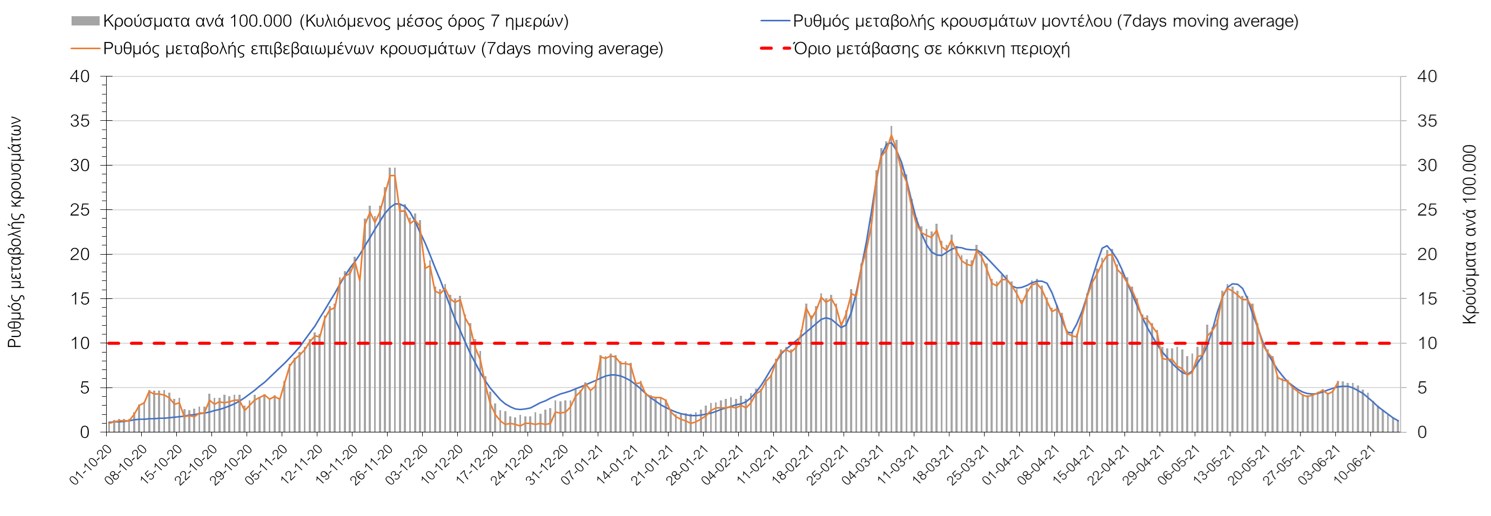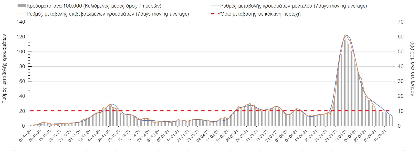 Σχήμα 44. Πορεία του ημερησίου αριθμού των κρουσμάτων (κυλιόμενος μέσος όρος 7 ημερών) στον ΈβροΣτο Ηράκλειο, όπου εντοπίστηκαν 26 κρούσματα παρατηρείται αύξηση σε σχέση με προχθές (Σχήμα 45). Λόγω των έντονων διακυμάνσεων που σημειώθηκαν στην πορεία της πανδημίας ως αποτέλεσμα του πολύ μεγάλου αριθμού φορέων του μεταλλαγμένου στελέχους Β.1.1.7, το Ηράκλειο είχε μεγάλη διασπορά του ιού και αυτή η δυναμική καθυστέρησε τον αποχαρακτηρισμό της περιοχής ως κόκκινη, στο όριο της οποίας βρίσκεται τώρα, και αναμένεται να συνεχιστεί η πτωτική πορεία. Στα Χανιά με 15 κρούσματα (Σχήμα 46) έχουμε μείωση σε σχέση με προχθές. Τα Χανιά θα παραμείνουν ανάμεσα στις κόκκινες περιοχές και μετά τις 10 Ιουνίου. Σταθερός αριθμός κρουσμάτων παρατηρείται στο Ρέθυμνο με 7 κρούσματα, στο οποίο η προ 15 ημερών ανοδική τάση, οδεύει σε πτωτική πορεία (Σχήμα 47), και η περιοχή αναμένεται να περιέλθει κάτω από το όριο του χαρακτηρισμού ως κόκκινη μετά τις 10 Ιουνίου. Στο Λασίθι παρατηρείται μείωση σε σχέση με προχθές, καθώς εντοπίστηκαν 4 κρούσματα και παρόλο που παρατηρούνται έντονες διακυμάνσεις (Σχήμα 48), η περιφερειακή ενότητα βρίσκεται κάτω από το όριο της κόκκινης περιοχής.