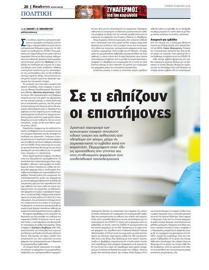Σε τι ελπίζουν οι επιστήμονεςΤων Δ. Πανανού – Κ. ΝικολόπουλουΣε συνθήκες ύψιστης εγρήγορσης βρίσκονται κορυφαίοι επιστήµονες ανά τον κόσµο, παρακολουθώντας στενά όλα τα επιδηµιολογικά δεδοµένα γύρω από την εξάπλωση της πανδηµίας του COVID-19 και µελετώντας τα επόµενα βήµατα στη µάχη κατά του κορονοϊού. Έλληνες και ξένοι γιατροί, επιδηµιολόγοι και καθηγητές ∆ηµόσιας Υγείας µεγάλων πανεπιστηµίων µιλούν στη Realnews για την εξέλιξη της πανδηµίας και εκτιµούν ότι ο αγώνας δρόµου στον οποίο αποδύεται η διεθνής επιστηµονική κοινότητα για την καταπολέµηση του µυστηριώδους νέου ιού θα αποδώσει σύντοµα καρπούς. Μέχρι τότε συνιστούν συστηµατική ατοµική υγιεινή και δραστικό περιορισµό των κοινωνικών επαφών.Διαβάστε εδώ το δημοσίευμα της Realnews