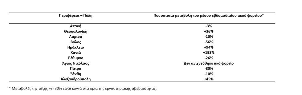 Πίνακας 1: Ποσοστιαία μεταβολή στη μέση συγκέντρωση του ιικού φορτίου του SARS-CoV-2 στα αστικά λύματα ανά 100.000 κατοίκους την εβδομάδα 10-16 Μαΐου 2021 σε σχέση με την εβδομάδα 3 – 9 Μαΐου 2021.