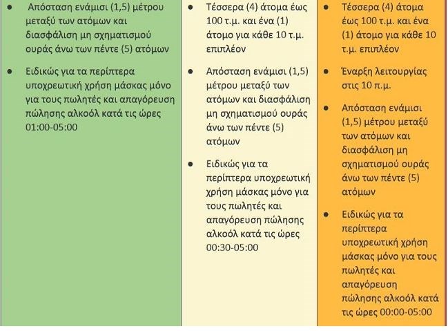 Έτσι, εκτός από την υποχρεωτική χρήση μάσκας στο προσωπικό στην εστίαση, τα 6 άτομα ανά τραπέζι, την πληρότητα 80% της ωφέλιμης επιφάνειας και τις αποστάσεις στα τραπεζοκαθίσματα στις πράσινες περιοχές επεκτείνεται η απαγόρευση της πώλησης αλκοόλ από τα περίπτερα μετά από κάποια συγκεκριμένη ώρα. Στις πράσινες περιοχές απαγορεύεται η πώληση αλκοόλ τις ώρες 01:00-05:00, στις περιοχές επιπέδου 2 από τις 00:30 έως τις 05:00 και σε αυτές του επιπέδου 3 από 00:00 έως 05:00.