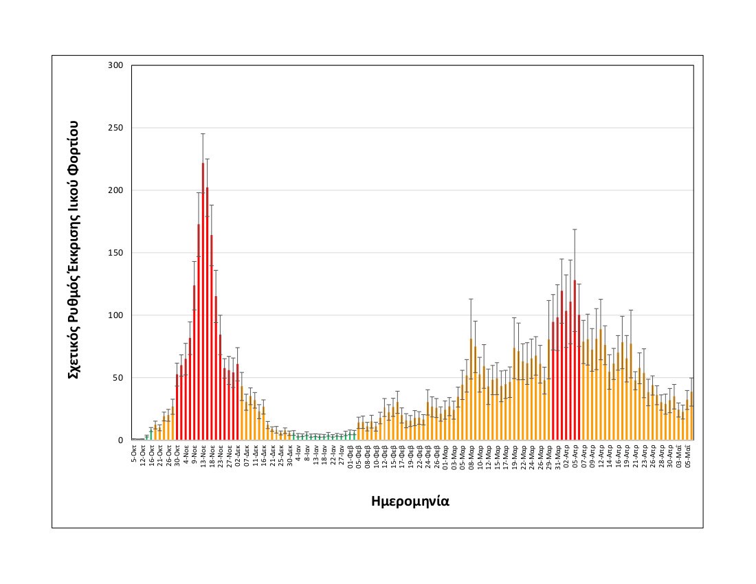 Όπως φαίνεται στα διαγράμματα έπειτα από τέσσερις εβδομάδες αποκλιμάκωσης, το ιικό φορτίο ανιχνεύεται στα επίπεδα της τελευταίας εβδομάδας του Απριλίου.