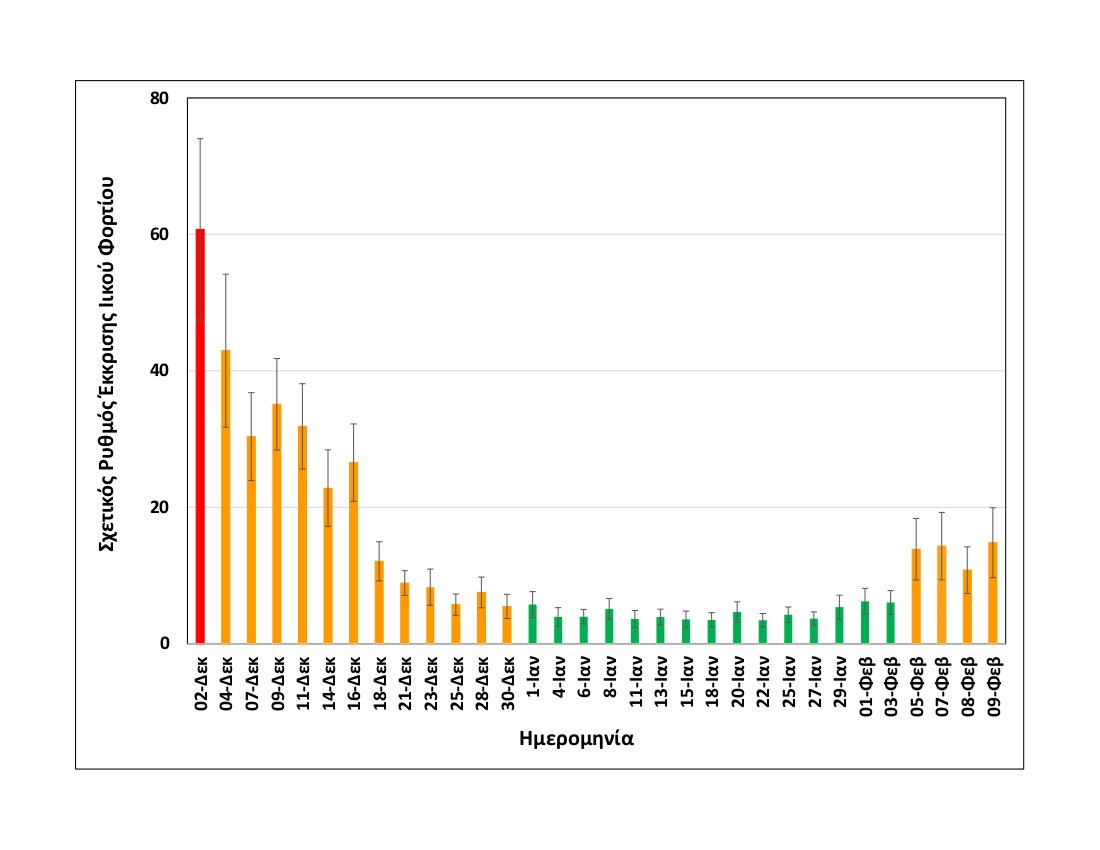 Στα διαγράμματα, οι ημέρες των δειγματοληψιών που καταγράφονται με κόκκινο χρώμα αντιστοιχούν σε περισσότερα από 500 κρούσματα – όπως ανακοινώθηκαν τις αντίστοιχες ημέρες από τον ΕΟΔΥ – οι μέρες που καταγράφονται με πορτοκαλί σε 100-400 κρούσματα και οι μέρες που καταγράφονται με πράσινο σε λιγότερα από εκατό κρούσματα.