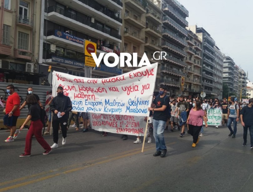 Ξεκίνησε η πορεία διαμαρτυρίας των μαθητών στο κέντρο της Θεσσαλονίκης. Οι μαθητές διεκδικούν όριο 15 ατόμων ανά τμήμα και προσλήψεις καθηγητών, ενώ ξεκαθαρίζουν πως οι κινητοποιήσεις δεν γίνονται για τις μάσκες, αλλά για τα προβλήματα στα σχολεία, που έχουν προκύψει λόγω της πανδημίας του κορονοϊού.