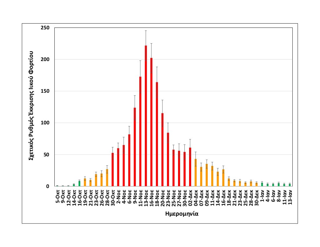 Στο διάγραμμα οι ημέρες των δειγματοληψιών που καταγράφονται με κόκκινο χρώμα αντιστοιχούν σε περισσότερα από 500 κρούσματα – όπως ανακοινώθηκαν τις αντίστοιχες ημέρες από τον ΕΟΔΥ – οι μέρες που καταγράφονται με πορτοκαλί σε 100-400 κρούσματα και οι μέρες που καταγράφονται με πράσινο σε λιγότερα από εκατό κρούσματα.
