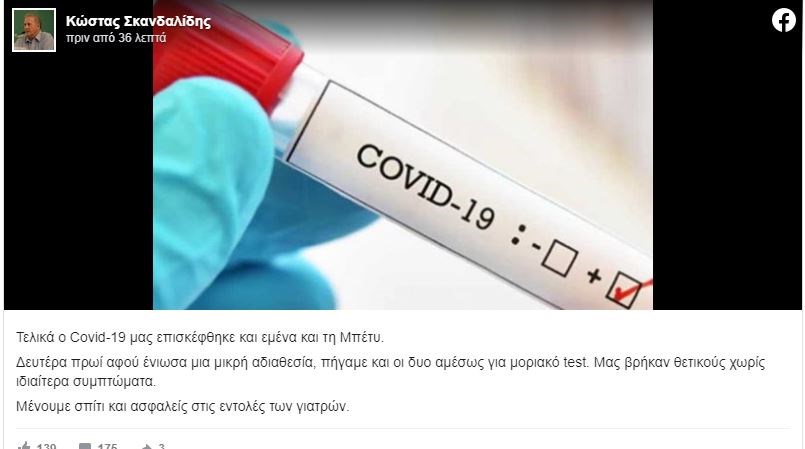 Θετικός στον κορονοϊό βρέθηκε ο βουλευτής του ΚΙΝΑΛ και πρώην υπουργός, Κώστας Σκανδαλίδης. Την είδηση έκανε γνωστή ο ίδιος με ανάρτησή του στο Facebook, όπου ανέφερε πως έχει προσβληθεί από τον ιό και η σύζυγός του, Μπέτυ. «Τελικά ο Covid-19 μας επισκέφθηκε και εμένα και τη Μπέτυ», ανέφερε χαρακτηριστικά.