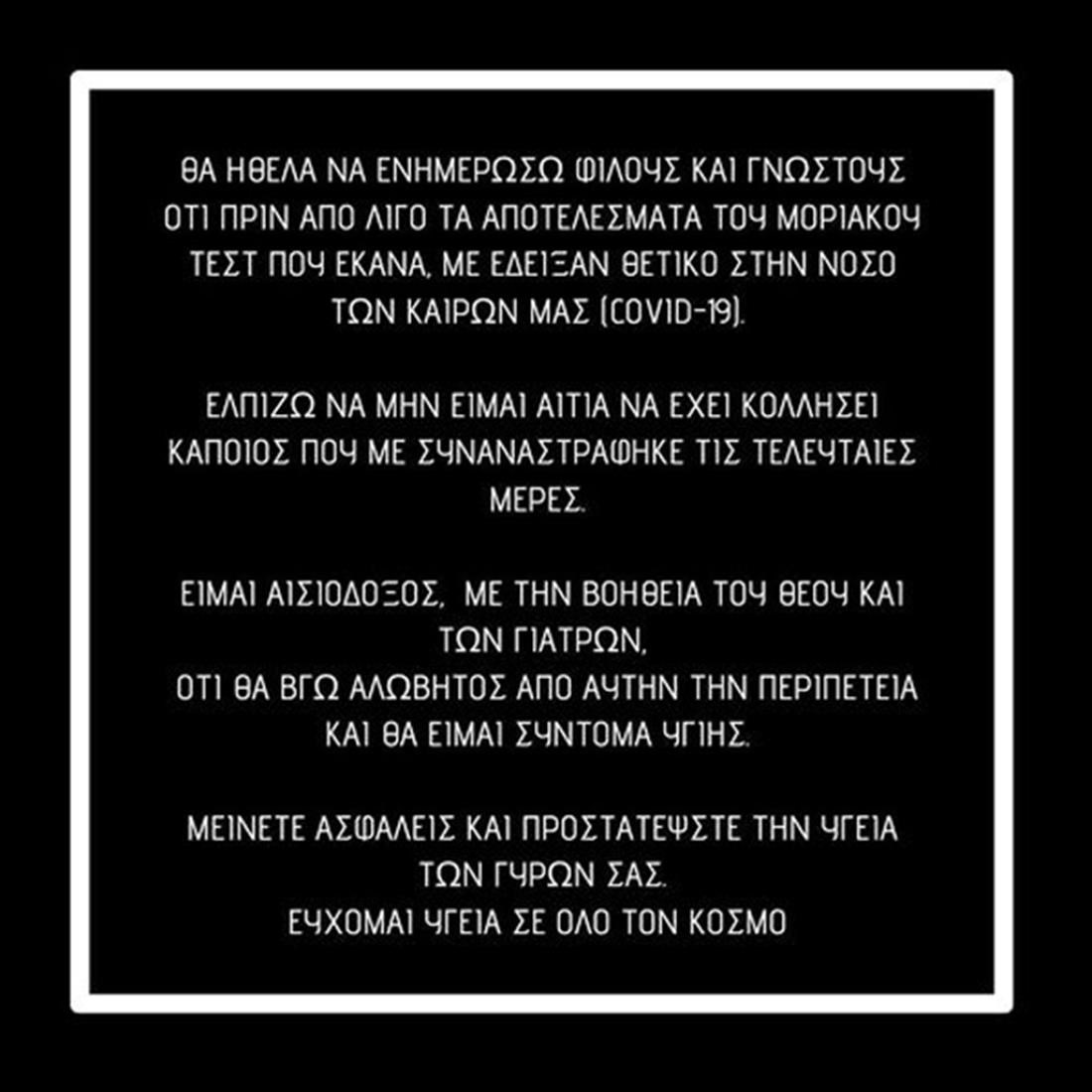 Θετικός στον κορονοϊό διαγνώστηκε ο Κρητικός μουσικός Μανώλης Κονταρός, έπειτα από μοριακό έλεγχο στον οποίο υπεβλήθη. Την είδηση έκανε γνωστή ο ίδιος, με σχετική του ανάρτηση στα μέσα κοινωνικής δικτύωσης.