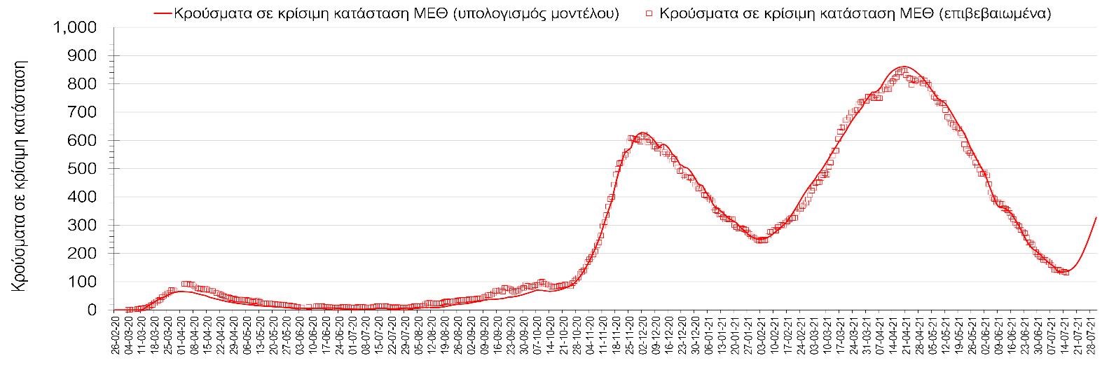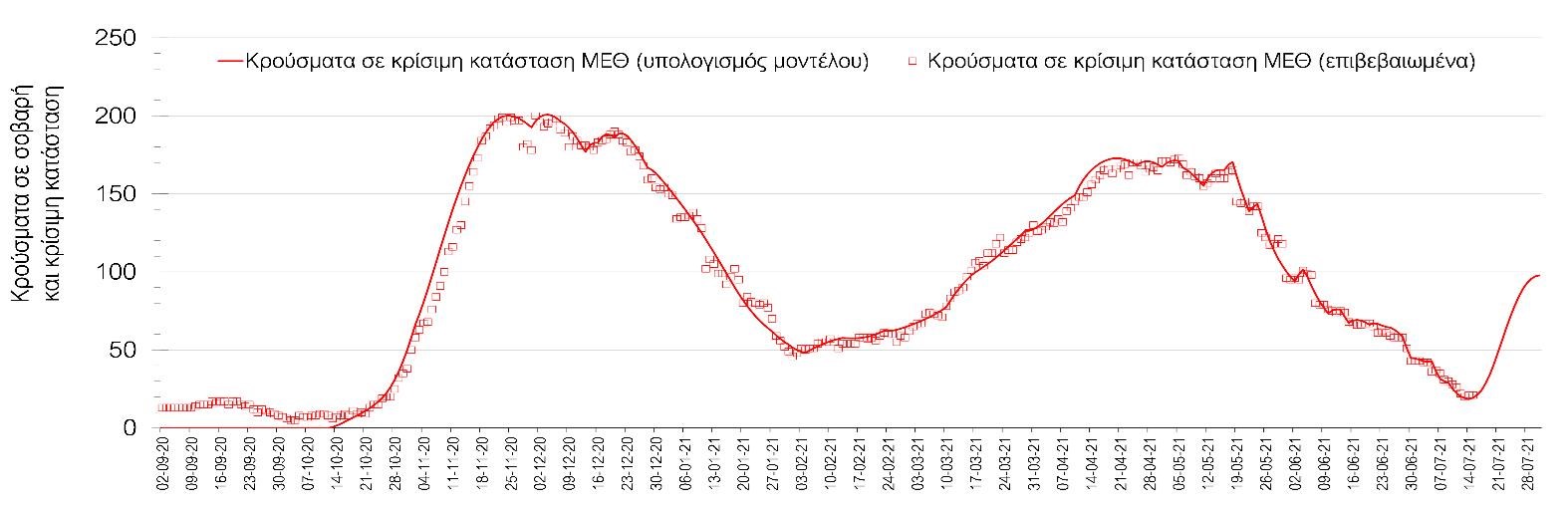 Στη Θεσσαλονίκη επίσης διαμορφώνεται πολύ έντονα αυξητική τάση (Σχήμα 7) ενώ η πορεία των κρουσμάτων σε κρίσιμη κατάσταση (διασωληνωμένοι σε ΜΕΘ) στη Θεσσαλονίκη ακολουθεί πλήρως τις προβλέψεις του μοντέλου και παρουσιάζεται στο Σχήμα 8.