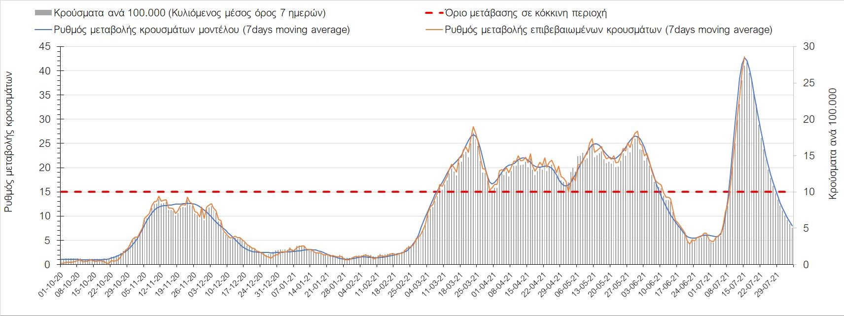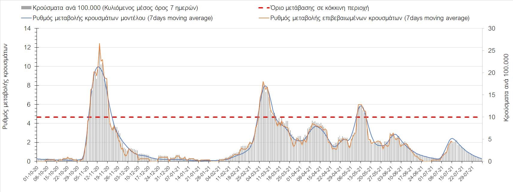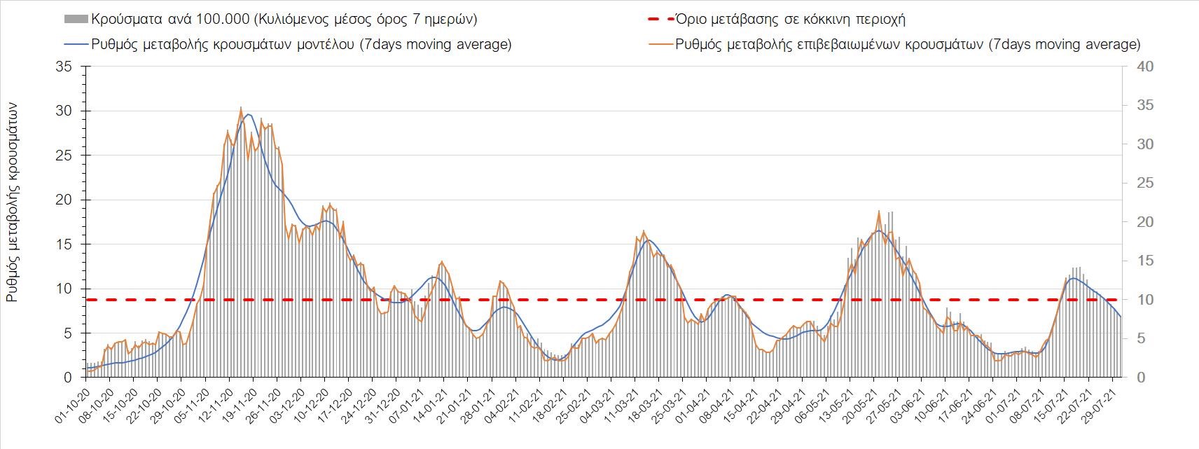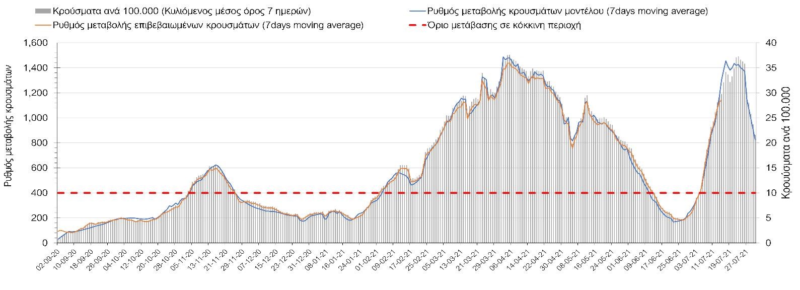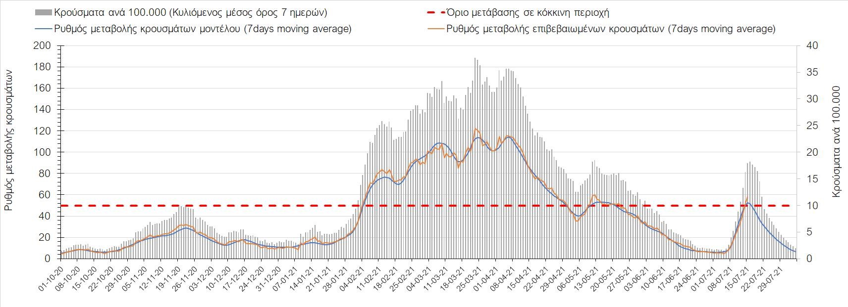 Σχήμα 4. Πορεία του ημερησίου αριθμού των κρουσμάτων (κυλιόμενος μέσος όρος 7 ημερών) στην Ελληνική επικράτεια