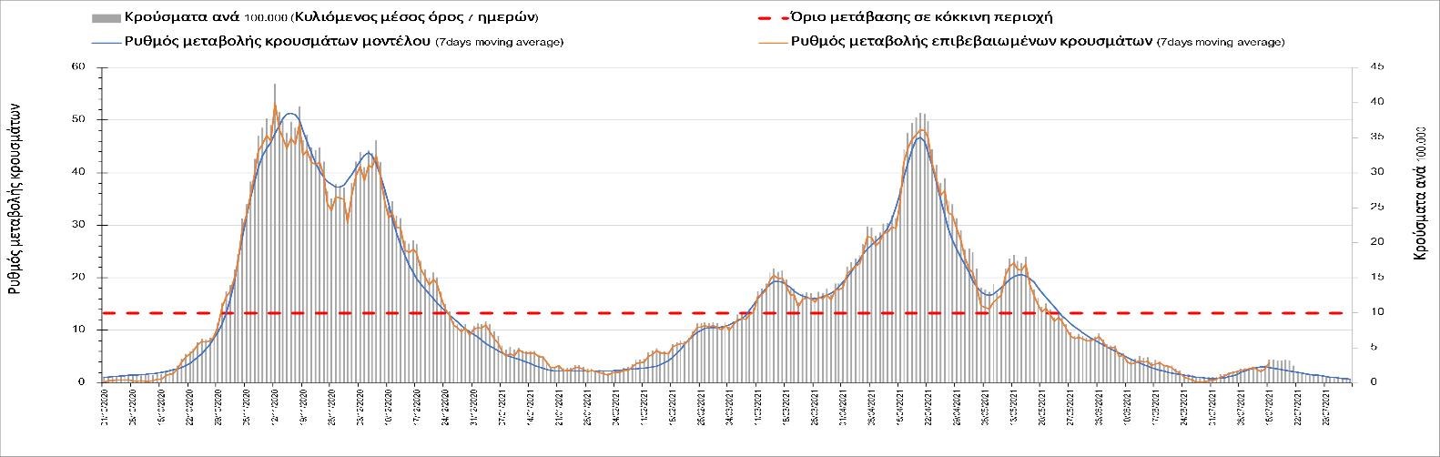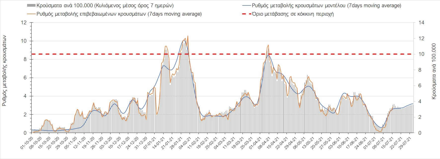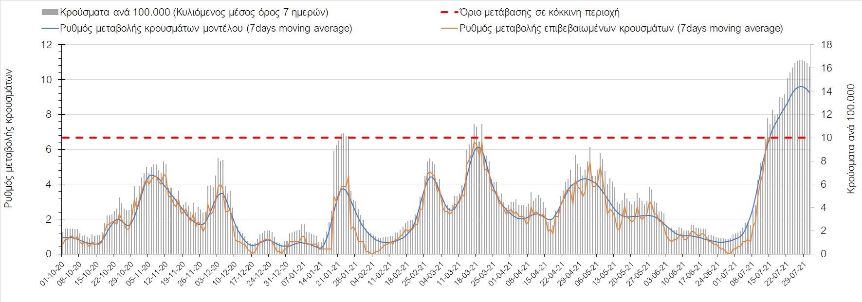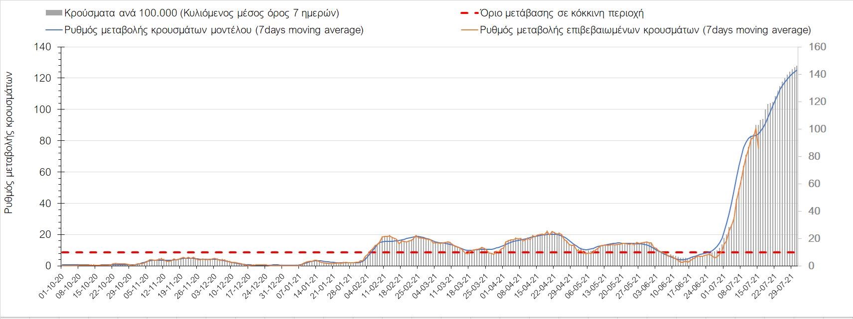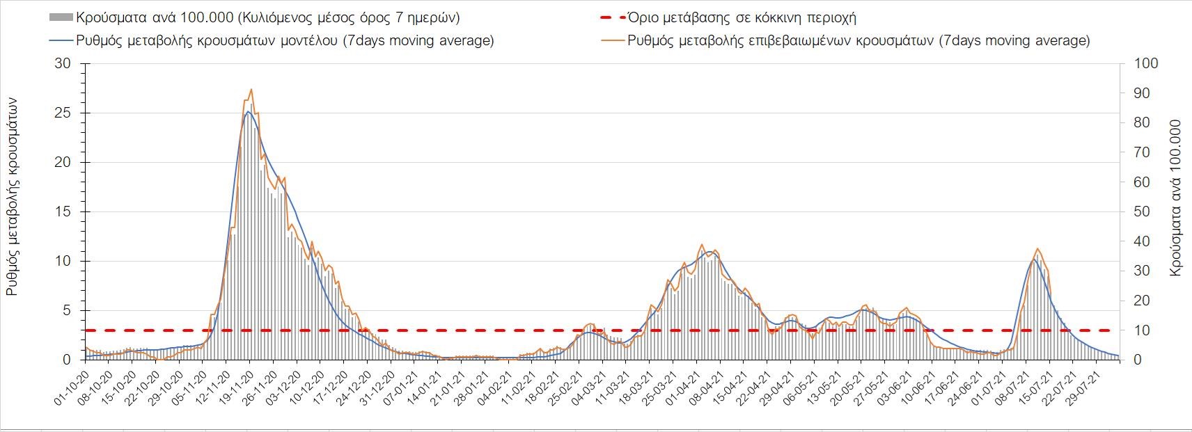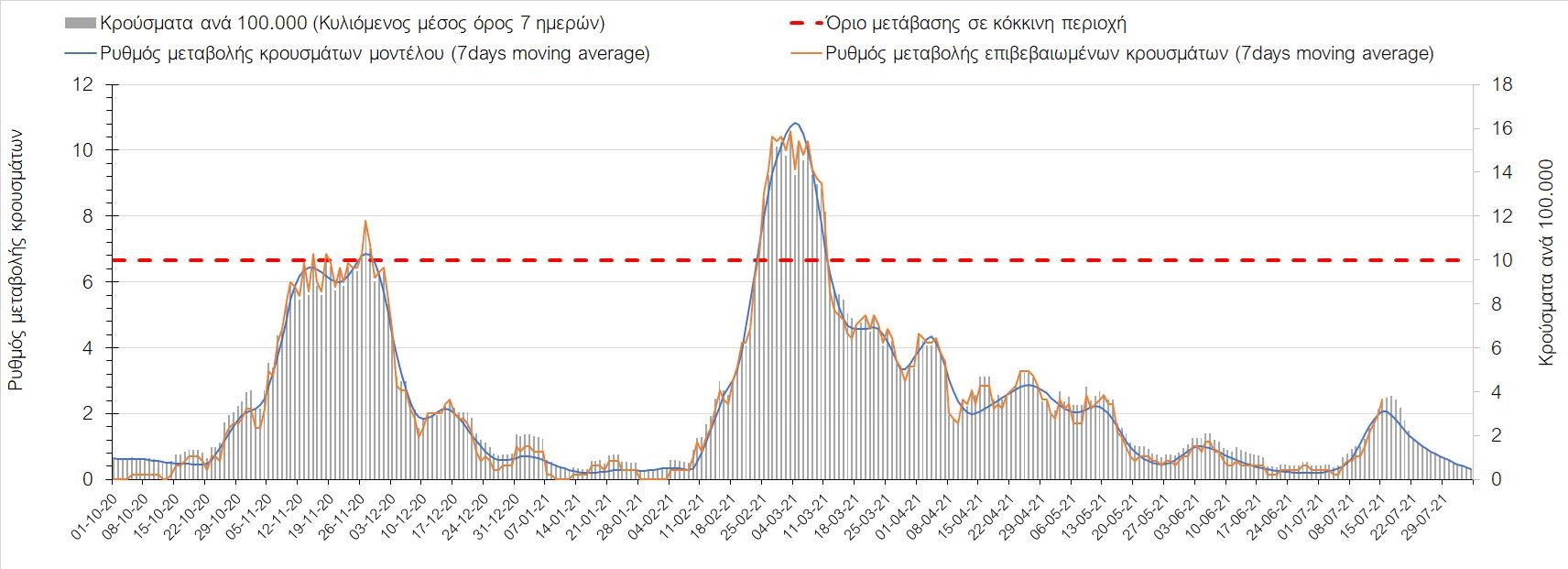Σχήμα 4. Πορεία του ημερησίου αριθμού των κρουσμάτων (κυλιόμενος μέσος όρος 7 ημερών) στην Ελληνική επικράτεια