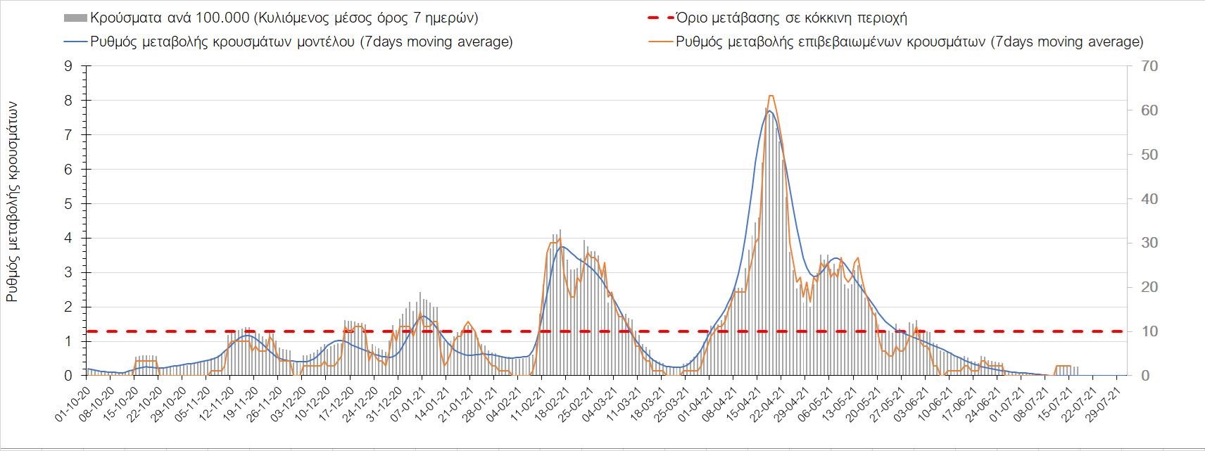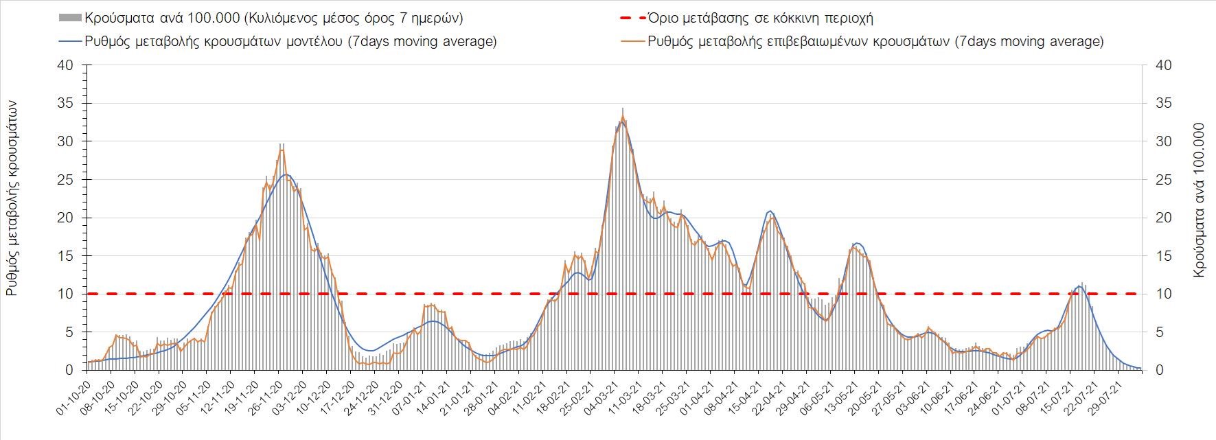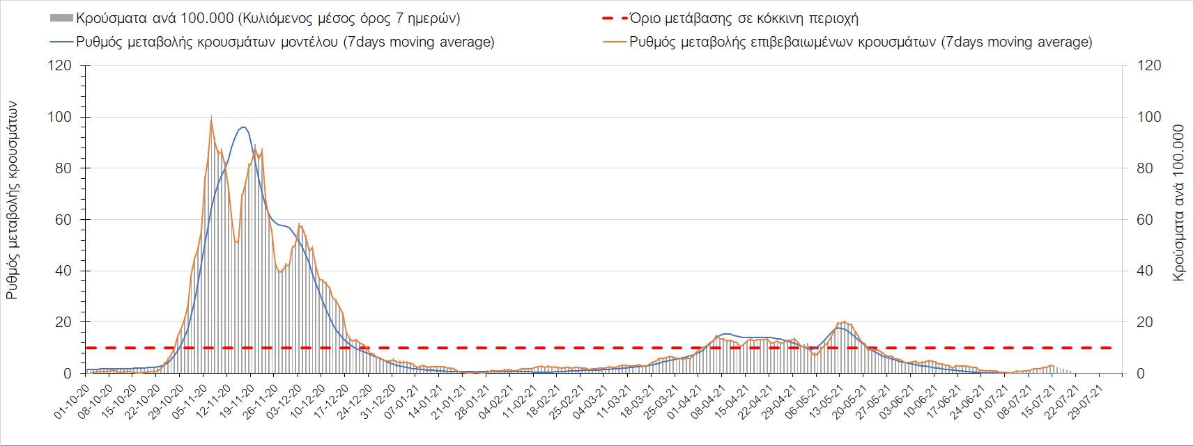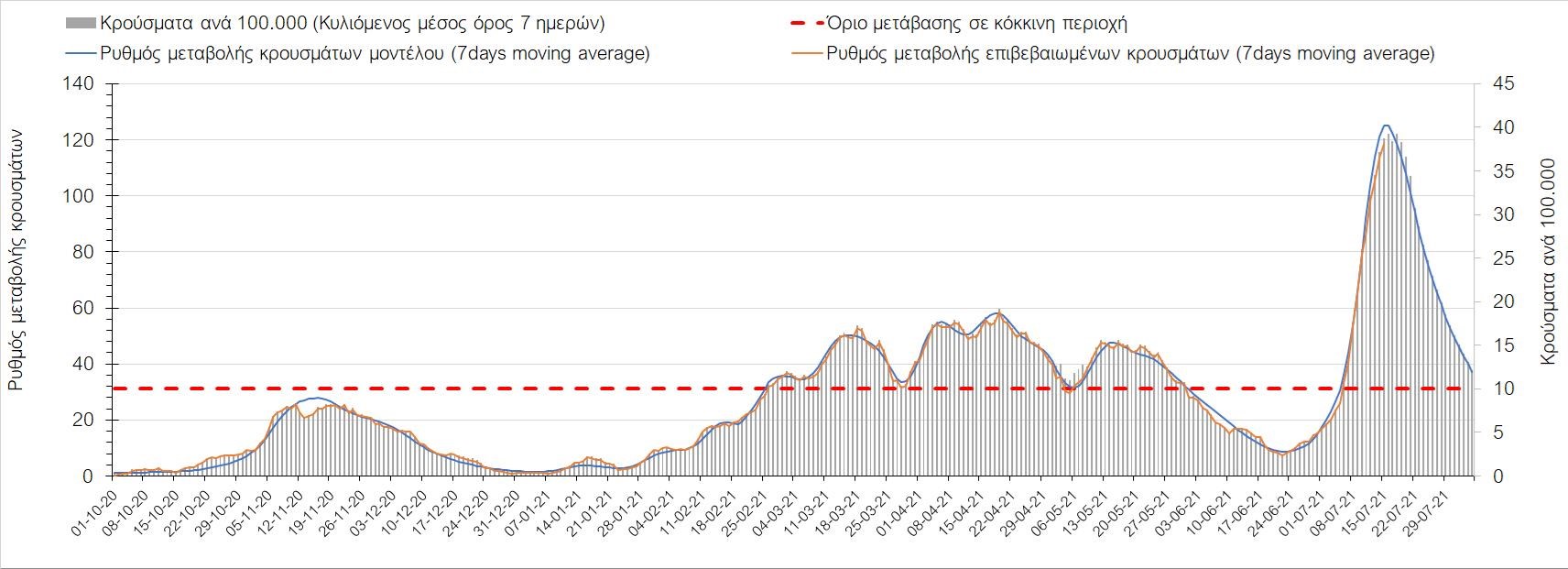 Σχήμα 37. Πορεία του ημερησίου αριθμού των κρουσμάτων (κυλιόμενος μέσος όρος 7 ημερών) στην Πιερία
