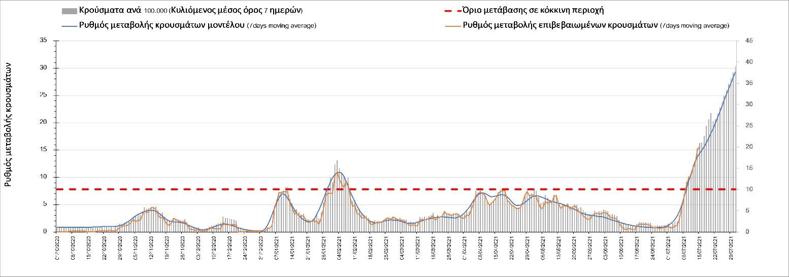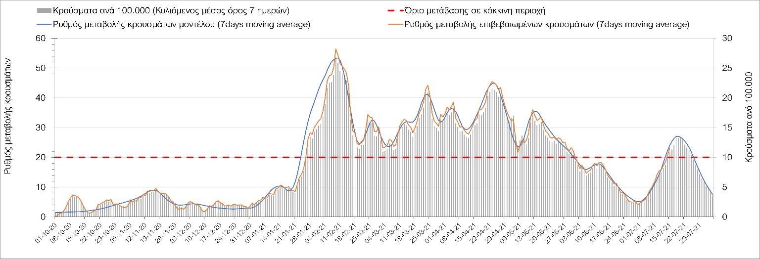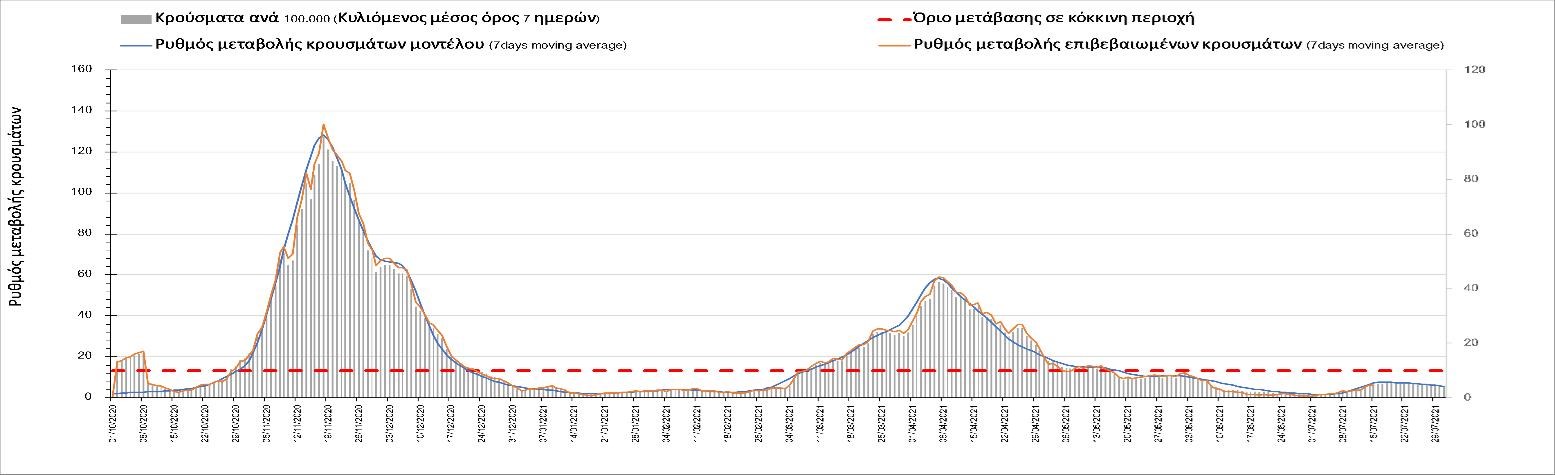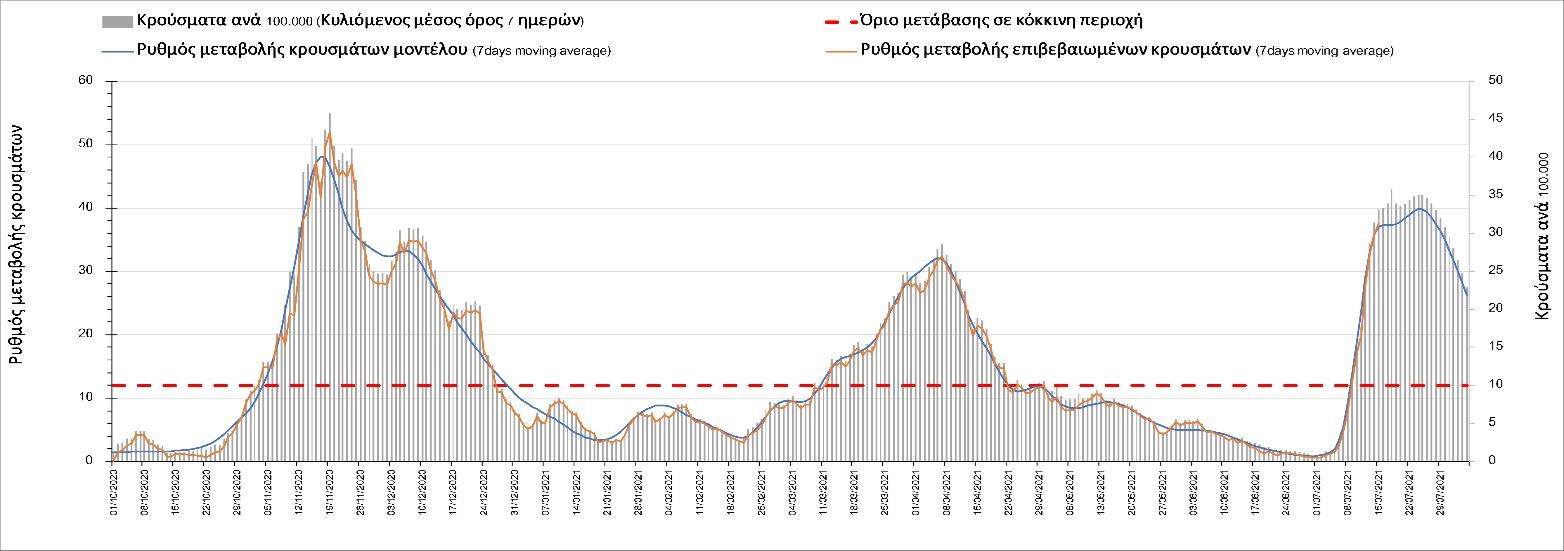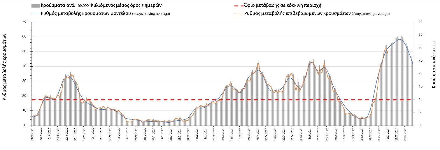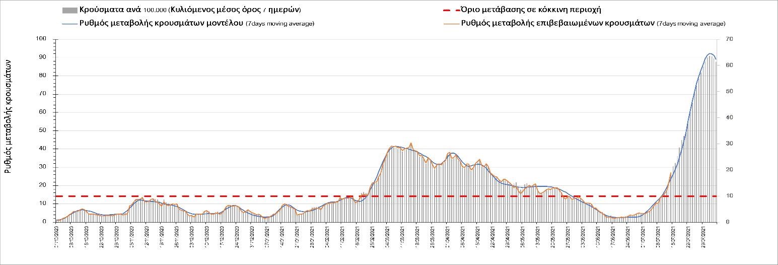 Με βάση τα αποτελέσματα της Πέμπτης, είχαμε πολύ ελαφρά μείωση των ασθενών σε κρίσιμη κατάσταση (διασωληνωμένοι σε ΜΕΘ) σε σχέση με την Τετάρτη, ενώ πλέον και οι θάνατοι παρουσιάζουν επιβράδυνση στις πτωτικές τάσεις, παρά τον πολύ χαμηλό αριθμό θανάτων και την Πέμπτη. Οι προβλέψεις αυτές συνάδουν με τις προσομοιώσεις του μοντέλου CORE, όπως και ο αριθμός των κρουσμάτων, ο οποίος παρουσιάζει αυξητικές τάσεις για το σύνολο της χώρας. Σε πανελλαδικό επίπεδο ο κυλιόμενος εβδομαδιαίος μέσος όρος του δείκτη θετικότητας διαμορφώθηκε στο 3,7% (η ημερήσια τιμή είναι 3,4%) ενώ ο κυλιόμενος εβδομαδιαίος μέσος όρος του πραγματικού αριθμού αναπαραγωγής Rt (δηλαδή ο αριθμός των ατόμων που ένας φορέας μπορεί να επιμολύνει) διαμορφώθηκε στο 1,73 (τιμές του Rt πάνω από τη μονάδα υποδηλώνουν αύξηση της διασποράς του ιού στην κοινότητα). Συνολικά η πορεία της πανδημίας ενώ ήταν πολύ καλή μέχρι και πριν 3 εβδομάδες, πλέον έχει μετασχηματιστεί σε έντονα ανοδική, όπως αντικατοπτρίζεται και από τον ημερήσιο αριθμό των κρουσμάτων (κυλιόμενος μέσος όρος 7 ημερών) που έφτασε στα 2385. Η πορεία της πανδημίας από την Τρίτη 29/6 είναι ανοδική (αρχικά κυρίως οφειλόμενη στη σημαντική αύξηση στην Αττική, αλλά πλέον και στη Θεσσαλονίκη και σε άλλες, επαρχιακές πόλεις), όπως υποδηλώνει και η αύξηση του Rt. Δυστυχώς πλέον, η μεγαλύτερη από τη φαινομενική διασπορά των μεταλλάξεων και τα υπάρχοντα ανοίγματα, έχουν ξεπεράσει τη δυναμική μείωσης της διασποράς λόγω της ανόδου της θερμοκρασίας και της επαγόμενης πτώσης της μεταδοτικότητας, του μεγάλου αριθμού των self-test (που όμως είναι λίγο μικρότερος σε σχέση με τις πρώτες εβδομάδες) και της προόδου των εμβολιασμών. Η επιδημιολογική εικόνα χθες σε σχέση με την προηγούμενη Πέμπτη, παρουσιάζεται στα συγκριτικά συγκεντρωτικά αποτελέσματα στο Σχήμα 53. Αξίζει να σημειωθεί ότι η τιμή αυτή του Rt είναι ιδιαίτερα υψηλή για την εποχή, και δε δικαιολογείται μόνο από την παρουσία μεταλλάξεων, αλλά συνδέεται και με φαινόμενα συρροής τα οποία παρατηρούνται κυρίως στην Αττική. Επειδή όμως πολύ έντονες αυξητικές τάσεις παρατηρούνται επιλεκτικά και σε άλλες περιοχές της Ελλάδας, χρειάζεται περαιτέρω διερεύνηση εάν η πολύ έντονη κατά τόπους αύξηση, συνδέεται με την παρουσία των ταχύτερα μεταδιδόμενων στελεχών, με φαινόμενα συρροής, ή με συνδυασμό αυτών, που είναι και το πιθανότερο. Στην πράξη δηλαδή, λόγω της αυξημένης μεταδοτικότητας των νέων στελεχών, τα φαινόμενα συρροής αποδεικνύονται πολύ πιο επιβαρυντικά για τη διασπορά της νόσου στην κοινότητα. Αυτό πρέπει να το έχουμε κατά νου για τη συνέχεια του καλοκαιριού και τη διαχείριση θρησκευτικών και άλλων παραδοσιακών εκδηλώσεων όπου συμβαίνουν φαινόμενα συρροής. Αξίζει να σημειωθεί ότι παρατηρείται σημαντική μείωση του Rt και διαφαίνεται επιβράδυνση της ανόδου. Συνεπώς αναμένουμε την πορεία των κρουσμάτων και τις επόμενες ημέρες για να δούμε σε ποιο βαθμό η έντονη άνοδος οφείλεται σε παροδικά φαινόμενα συρροών.