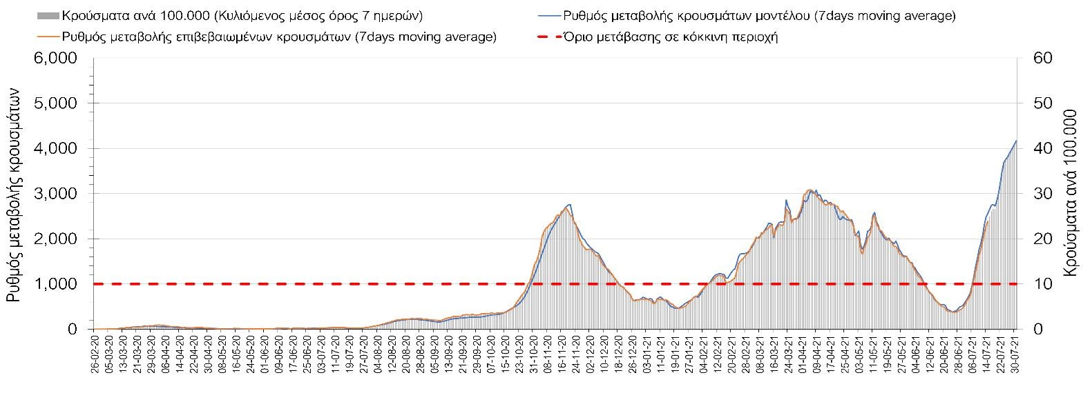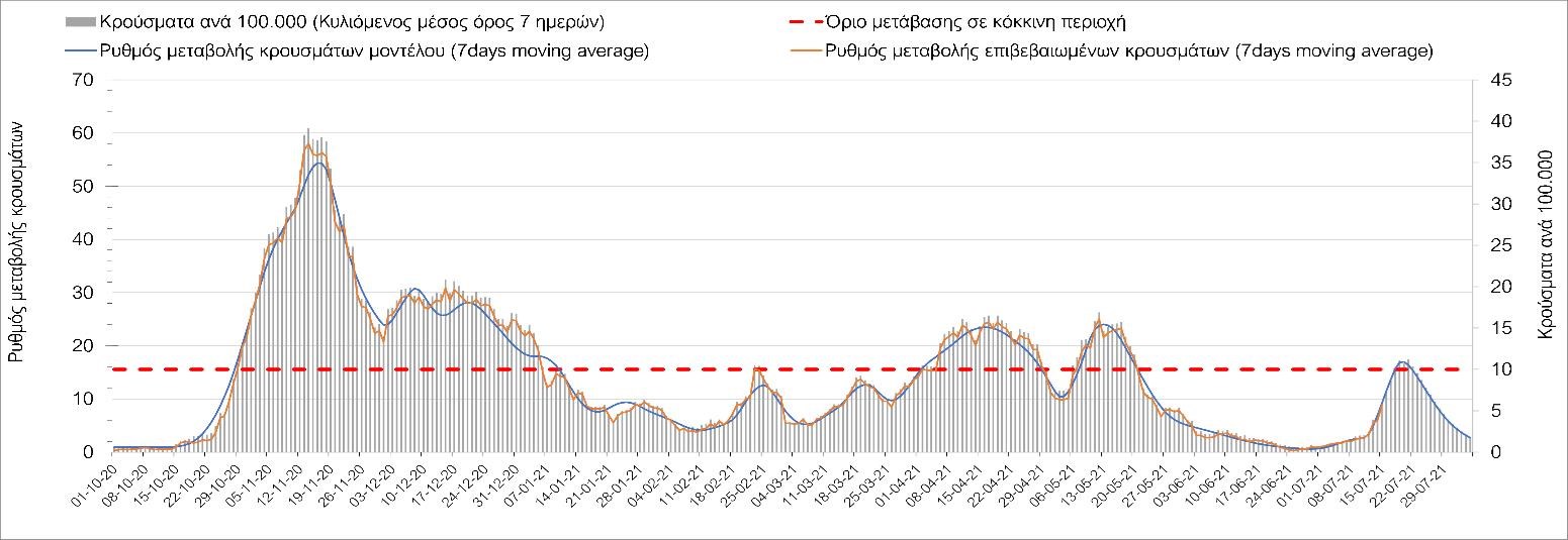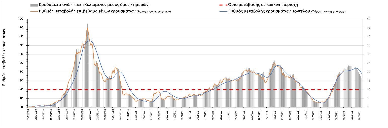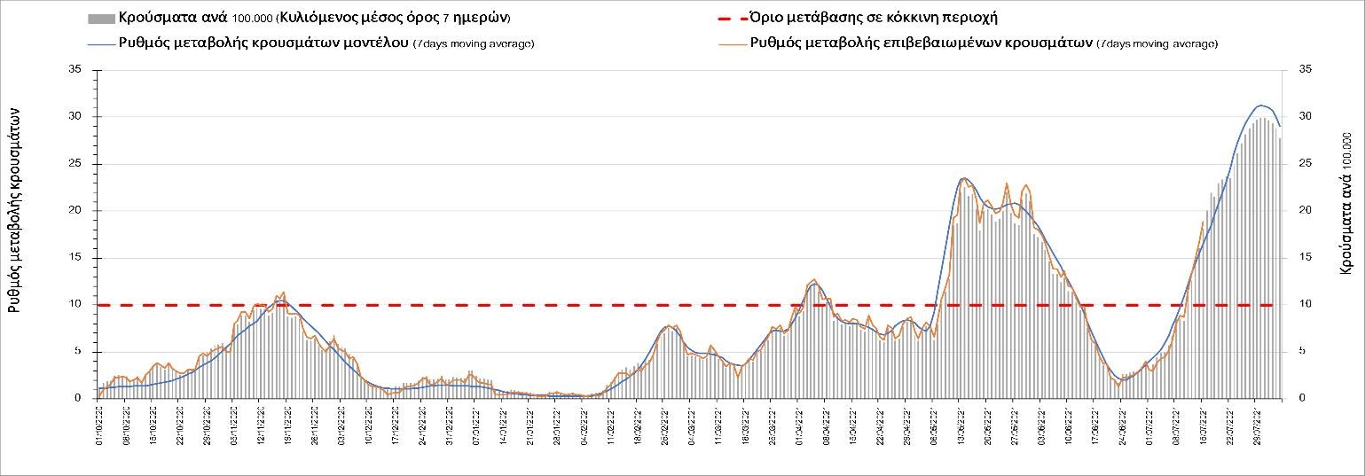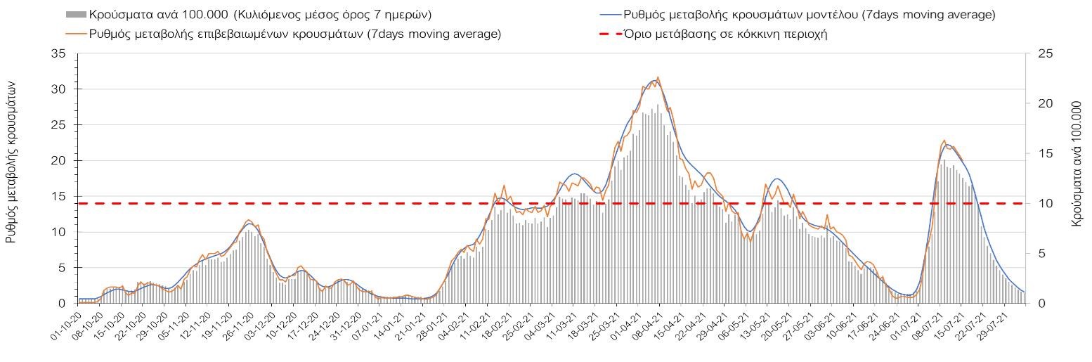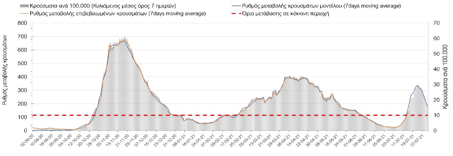 Με βάση τα αποτελέσματα της Πέμπτης, είχαμε πολύ ελαφρά μείωση των ασθενών σε κρίσιμη κατάσταση (διασωληνωμένοι σε ΜΕΘ) σε σχέση με την Τετάρτη, ενώ πλέον και οι θάνατοι παρουσιάζουν επιβράδυνση στις πτωτικές τάσεις, παρά τον πολύ χαμηλό αριθμό θανάτων και την Πέμπτη. Οι προβλέψεις αυτές συνάδουν με τις προσομοιώσεις του μοντέλου CORE, όπως και ο αριθμός των κρουσμάτων, ο οποίος παρουσιάζει αυξητικές τάσεις για το σύνολο της χώρας. Σε πανελλαδικό επίπεδο ο κυλιόμενος εβδομαδιαίος μέσος όρος του δείκτη θετικότητας διαμορφώθηκε στο 3,7% (η ημερήσια τιμή είναι 3,4%) ενώ ο κυλιόμενος εβδομαδιαίος μέσος όρος του πραγματικού αριθμού αναπαραγωγής Rt (δηλαδή ο αριθμός των ατόμων που ένας φορέας μπορεί να επιμολύνει) διαμορφώθηκε στο 1,73 (τιμές του Rt πάνω από τη μονάδα υποδηλώνουν αύξηση της διασποράς του ιού στην κοινότητα). Συνολικά η πορεία της πανδημίας ενώ ήταν πολύ καλή μέχρι και πριν 3 εβδομάδες, πλέον έχει μετασχηματιστεί σε έντονα ανοδική, όπως αντικατοπτρίζεται και από τον ημερήσιο αριθμό των κρουσμάτων (κυλιόμενος μέσος όρος 7 ημερών) που έφτασε στα 2385. Η πορεία της πανδημίας από την Τρίτη 29/6 είναι ανοδική (αρχικά κυρίως οφειλόμενη στη σημαντική αύξηση στην Αττική, αλλά πλέον και στη Θεσσαλονίκη και σε άλλες, επαρχιακές πόλεις), όπως υποδηλώνει και η αύξηση του Rt. Δυστυχώς πλέον, η μεγαλύτερη από τη φαινομενική διασπορά των μεταλλάξεων και τα υπάρχοντα ανοίγματα, έχουν ξεπεράσει τη δυναμική μείωσης της διασποράς λόγω της ανόδου της θερμοκρασίας και της επαγόμενης πτώσης της μεταδοτικότητας, του μεγάλου αριθμού των self-test (που όμως είναι λίγο μικρότερος σε σχέση με τις πρώτες εβδομάδες) και της προόδου των εμβολιασμών. Η επιδημιολογική εικόνα χθες σε σχέση με την προηγούμενη Πέμπτη, παρουσιάζεται στα συγκριτικά συγκεντρωτικά αποτελέσματα στο Σχήμα 53. Αξίζει να σημειωθεί ότι η τιμή αυτή του Rt είναι ιδιαίτερα υψηλή για την εποχή, και δε δικαιολογείται μόνο από την παρουσία μεταλλάξεων, αλλά συνδέεται και με φαινόμενα συρροής τα οποία παρατηρούνται κυρίως στην Αττική. Επειδή όμως πολύ έντονες αυξητικές τάσεις παρατηρούνται επιλεκτικά και σε άλλες περιοχές της Ελλάδας, χρειάζεται περαιτέρω διερεύνηση εάν η πολύ έντονη κατά τόπους αύξηση, συνδέεται με την παρουσία των ταχύτερα μεταδιδόμενων στελεχών, με φαινόμενα συρροής, ή με συνδυασμό αυτών, που είναι και το πιθανότερο. Στην πράξη δηλαδή, λόγω της αυξημένης μεταδοτικότητας των νέων στελεχών, τα φαινόμενα συρροής αποδεικνύονται πολύ πιο επιβαρυντικά για τη διασπορά της νόσου στην κοινότητα. Αυτό πρέπει να το έχουμε κατά νου για τη συνέχεια του καλοκαιριού και τη διαχείριση θρησκευτικών και άλλων παραδοσιακών εκδηλώσεων όπου συμβαίνουν φαινόμενα συρροής. Αξίζει να σημειωθεί ότι παρατηρείται σημαντική μείωση του Rt και διαφαίνεται επιβράδυνση της ανόδου. Συνεπώς αναμένουμε την πορεία των κρουσμάτων και τις επόμενες ημέρες για να δούμε σε ποιο βαθμό η έντονη άνοδος οφείλεται σε παροδικά φαινόμενα συρροών.