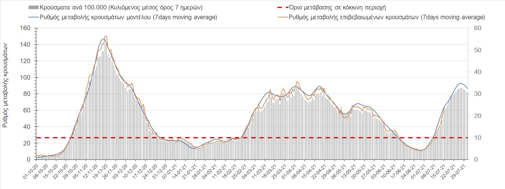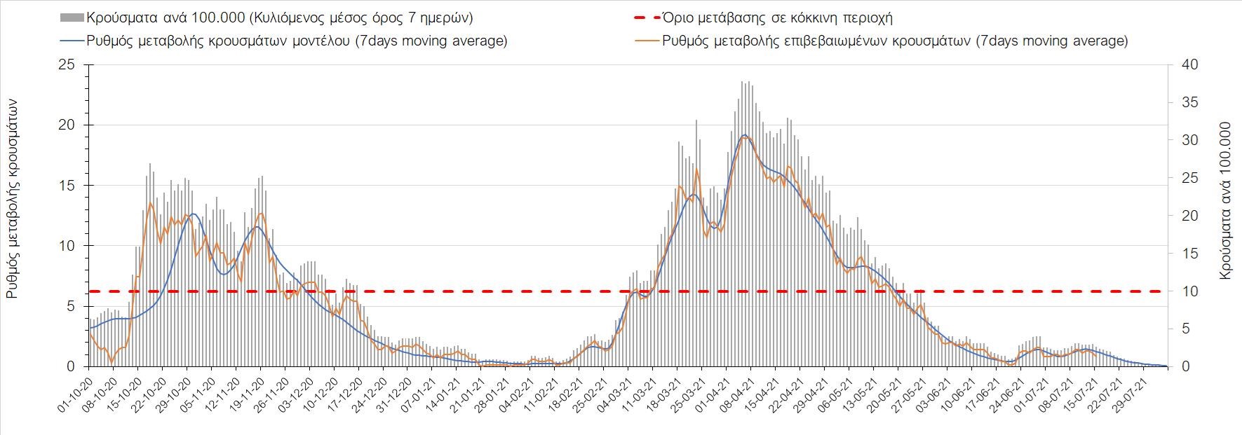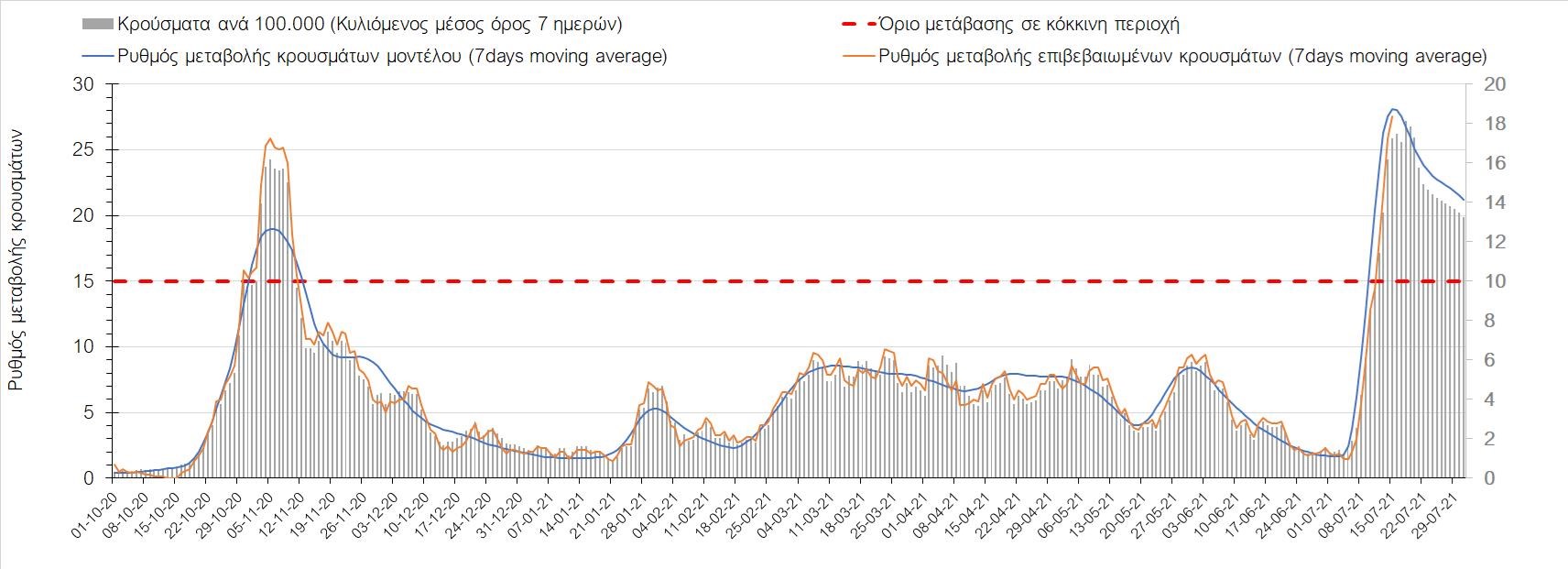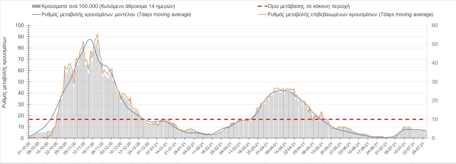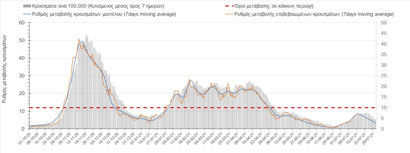 Με βάση τα αποτελέσματα της Πέμπτης, είχαμε πολύ ελαφρά μείωση των ασθενών σε κρίσιμη κατάσταση (διασωληνωμένοι σε ΜΕΘ) σε σχέση με την Τετάρτη, ενώ πλέον και οι θάνατοι παρουσιάζουν επιβράδυνση στις πτωτικές τάσεις, παρά τον πολύ χαμηλό αριθμό θανάτων και την Πέμπτη. Οι προβλέψεις αυτές συνάδουν με τις προσομοιώσεις του μοντέλου CORE, όπως και ο αριθμός των κρουσμάτων, ο οποίος παρουσιάζει αυξητικές τάσεις για το σύνολο της χώρας. Σε πανελλαδικό επίπεδο ο κυλιόμενος εβδομαδιαίος μέσος όρος του δείκτη θετικότητας διαμορφώθηκε στο 3,7% (η ημερήσια τιμή είναι 3,4%) ενώ ο κυλιόμενος εβδομαδιαίος μέσος όρος του πραγματικού αριθμού αναπαραγωγής Rt (δηλαδή ο αριθμός των ατόμων που ένας φορέας μπορεί να επιμολύνει) διαμορφώθηκε στο 1,73 (τιμές του Rt πάνω από τη μονάδα υποδηλώνουν αύξηση της διασποράς του ιού στην κοινότητα). Συνολικά η πορεία της πανδημίας ενώ ήταν πολύ καλή μέχρι και πριν 3 εβδομάδες, πλέον έχει μετασχηματιστεί σε έντονα ανοδική, όπως αντικατοπτρίζεται και από τον ημερήσιο αριθμό των κρουσμάτων (κυλιόμενος μέσος όρος 7 ημερών) που έφτασε στα 2385. Η πορεία της πανδημίας από την Τρίτη 29/6 είναι ανοδική (αρχικά κυρίως οφειλόμενη στη σημαντική αύξηση στην Αττική, αλλά πλέον και στη Θεσσαλονίκη και σε άλλες, επαρχιακές πόλεις), όπως υποδηλώνει και η αύξηση του Rt. Δυστυχώς πλέον, η μεγαλύτερη από τη φαινομενική διασπορά των μεταλλάξεων και τα υπάρχοντα ανοίγματα, έχουν ξεπεράσει τη δυναμική μείωσης της διασποράς λόγω της ανόδου της θερμοκρασίας και της επαγόμενης πτώσης της μεταδοτικότητας, του μεγάλου αριθμού των self-test (που όμως είναι λίγο μικρότερος σε σχέση με τις πρώτες εβδομάδες) και της προόδου των εμβολιασμών. Η επιδημιολογική εικόνα χθες σε σχέση με την προηγούμενη Πέμπτη, παρουσιάζεται στα συγκριτικά συγκεντρωτικά αποτελέσματα στο Σχήμα 53. Αξίζει να σημειωθεί ότι η τιμή αυτή του Rt είναι ιδιαίτερα υψηλή για την εποχή, και δε δικαιολογείται μόνο από την παρουσία μεταλλάξεων, αλλά συνδέεται και με φαινόμενα συρροής τα οποία παρατηρούνται κυρίως στην Αττική. Επειδή όμως πολύ έντονες αυξητικές τάσεις παρατηρούνται επιλεκτικά και σε άλλες περιοχές της Ελλάδας, χρειάζεται περαιτέρω διερεύνηση εάν η πολύ έντονη κατά τόπους αύξηση, συνδέεται με την παρουσία των ταχύτερα μεταδιδόμενων στελεχών, με φαινόμενα συρροής, ή με συνδυασμό αυτών, που είναι και το πιθανότερο. Στην πράξη δηλαδή, λόγω της αυξημένης μεταδοτικότητας των νέων στελεχών, τα φαινόμενα συρροής αποδεικνύονται πολύ πιο επιβαρυντικά για τη διασπορά της νόσου στην κοινότητα. Αυτό πρέπει να το έχουμε κατά νου για τη συνέχεια του καλοκαιριού και τη διαχείριση θρησκευτικών και άλλων παραδοσιακών εκδηλώσεων όπου συμβαίνουν φαινόμενα συρροής. Αξίζει να σημειωθεί ότι παρατηρείται σημαντική μείωση του Rt και διαφαίνεται επιβράδυνση της ανόδου. Συνεπώς αναμένουμε την πορεία των κρουσμάτων και τις επόμενες ημέρες για να δούμε σε ποιο βαθμό η έντονη άνοδος οφείλεται σε παροδικά φαινόμενα συρροών.