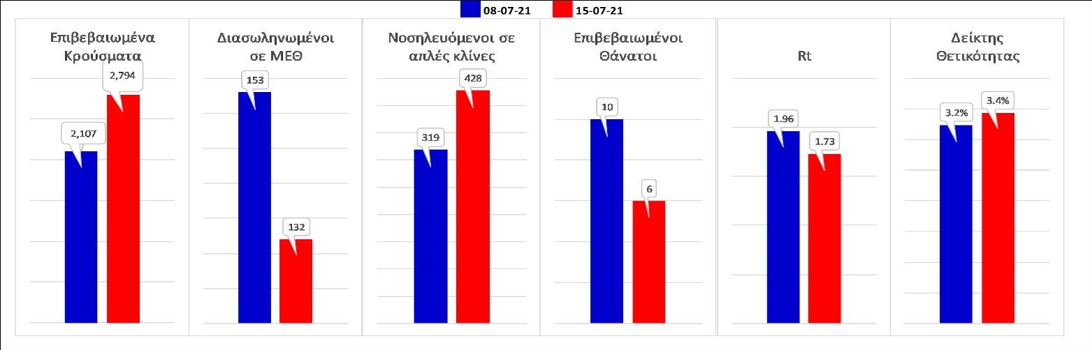 Σχήμα 53. Συγκριτικά αποτελέσματα της επιδημιολογικής εικόνας της Πέμπτης (15/07/2021) σε σχέση με την προηγούμενη (08/07/2021)