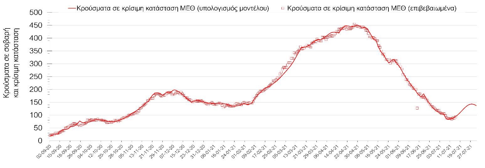 Όσον αφορά στους ασθενείς σε κρίσιμη κατάσταση (διασωληνωμένοι σε ΜΕΘ), ο αριθμός είναι ελαφρώς μειωμένος σε σχέση με την Τετάρτη (132 από 135), και πλέον βλέπουμε την (έστω ήπια) αναστροφή της πτώσης να συμβαίνει στη χρονική στιγμή που αναμέναμε. Η καμπύλη εξέλιξης του αριθμού των ασθενών που νοσηλεύονται σε κλίνες ΜΕΘ με βάση τις προσομοιώσεις της πλατφόρμας CORE, όπως αυτή παρουσιάζεται στο Σχήμα 1, των ασθενών που νοσηλεύονται σε απλές κλίνες στο Σχήμα 2 (όπου διαφαίνεται πλέον η αναμενόμενη αύξηση στις νοσηλείες), ενώ μια εκτίμηση για την πορεία των θανάτων ανά ημέρα παρουσιάζεται στο Σχήμα 3.