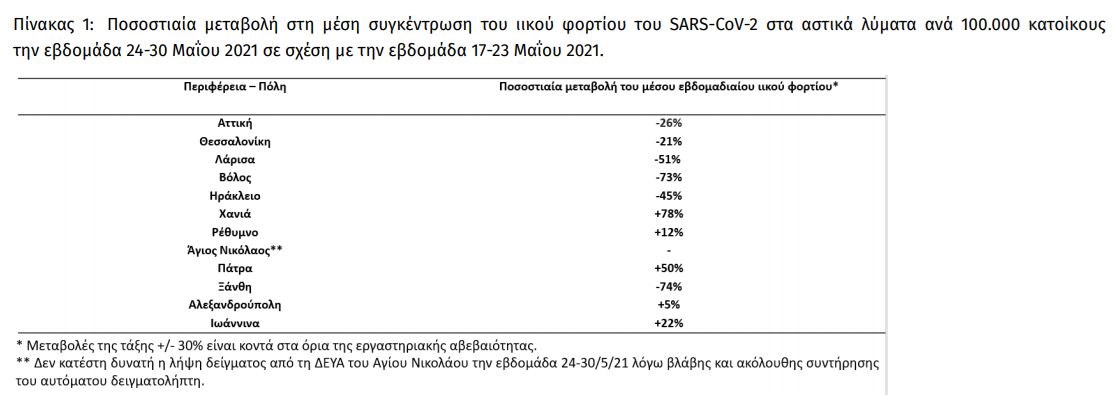 Ανακοινώνονται τα αποτελέσματα των εργαστηριακών ελέγχων του Εθνικού Δικτύου Επιδημιολογίας Λυμάτων για την επιδημιολογική επιτήρηση του ιού SARS-CoV-2 σε αστικά λύματα, το οποίο λειτουργεί υπό το συντονισμό του ΕΟΔΥ. Τα αποτελέσματα αφορούν στην εβδομάδα 24 έως 30 Μαΐου 2021. Τα δείγματα προέρχονται από την Περιφέρεια Αττικής και τις πόλεις της Θεσσαλονίκης, της Λάρισας, του Βόλου, του Ηρακλείου, των Χανίων, του Ρεθύμνου, του Αγίου Νικολάου Λασιθίου, της Πάτρας, της Ξάνθης, της Αλεξανδρούπολης και των Ιωαννίνων. Τα δείγματα λαμβάνονται από τις εισόδους των κατά τόπους Μονάδων Επεξεργασίας Λυμάτων και αντιστοιχούν στον πληθυσμό που εξυπηρετείται από αυτές. Πίνακας 1: Ποσοστιαία μεταβολή στη μέση συγκέντρωση του ιικού φορτίου του SARS-CoV-2 στα αστικά λύματα ανά 100.000 κατοίκους την εβδομάδα 24-30 Μαΐου 2021 σε σχέση με την εβδομάδα 17-23 Μαΐου 2021.