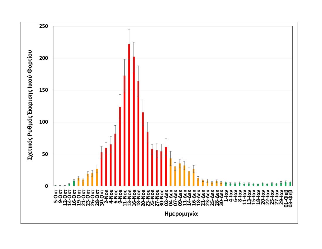 Στα συνημμένα διαγράμματα που παρουσιάζει το ΑΠΕ-ΜΠΕ οι ημέρες των δειγματοληψιών που καταγράφονται με κόκκινο χρώμα αντιστοιχούν σε περισσότερα από 500 κρούσματα – όπως ανακοινώθηκαν τις αντίστοιχες ημέρες από τον ΕΟΔΥ – οι μέρες που καταγράφονται με πορτοκαλί σε 100-400 κρούσματα και οι μέρες που καταγράφονται με πράσινο σε λιγότερα από εκατό κρούσματα.