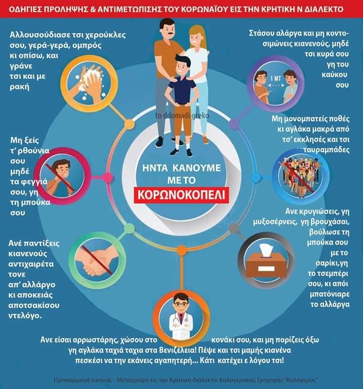 Τον γύρο του διαδικτύου κάνει τις τελευταίες ώρες μία κάρτα με οδηγίες πρόληψης και αντιμετώπισης του κορονοϊού στην κρητική διάλεκτο. Με άφθονο χιούμορ, οι χρήστες των social media δημοσιεύουν την εν λόγω κάρτα και ορισμένοι εξ’ αυτών με καταγωγή από την Κρήτη προσφέρονται να κάνουν και… μετάφραση.