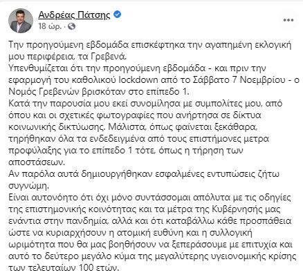 Σε ανάρτησή του στα social media, ο βουλευτής σημειώνει ότι “όπως φαίνεται ξεκάθαρα, τηρήθηκαν όλα τα ενδεδειγμένα από τους επιστήμονες μέτρα προφύλαξης για το επίπεδο 1 τότε, όπως η τήρηση των αποστάσεων”, ωστόσο τονίζει ότι “αν παρόλα αυτά δημιουργήθηκαν εσφαλμένες εντυπώσεις ζήτω συγγνώμη”.