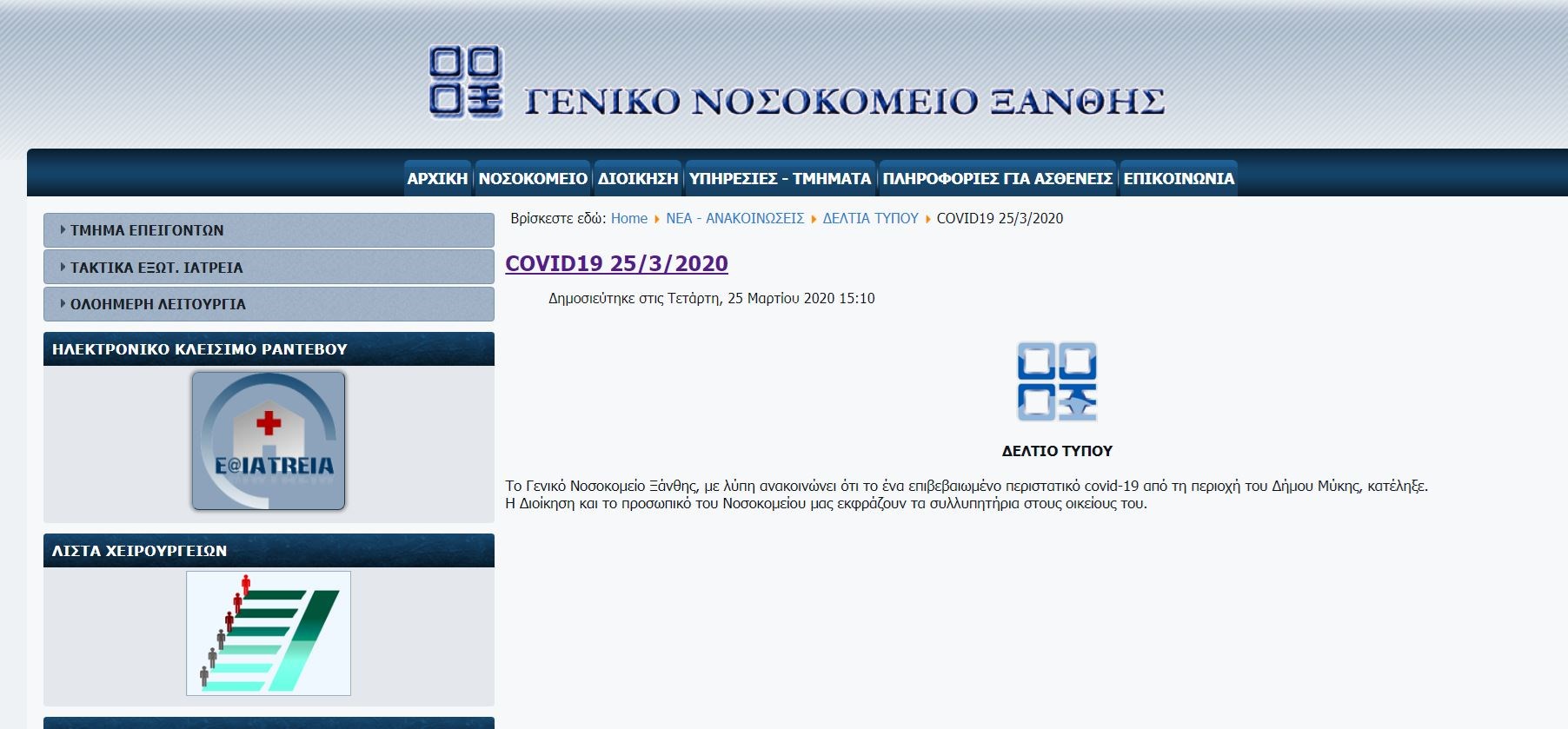 “Το Γενικό Νοσοκομείο Ξάνθης, με λύπη ανακοινώνει ότι το ένα επιβεβαιωμένο περιστατικό covid-19 από τη περιοχή του Δήμου Μύκης, κατέληξε. Η Διοίκηση και το προσωπικό του Νοσοκομείου μας εκφράζουν τα συλλυπητήρια στους οικείους του” αναφέρει σε ανακοίνωση του το Γενικό Νοσοκομείο Ξάνθης.
