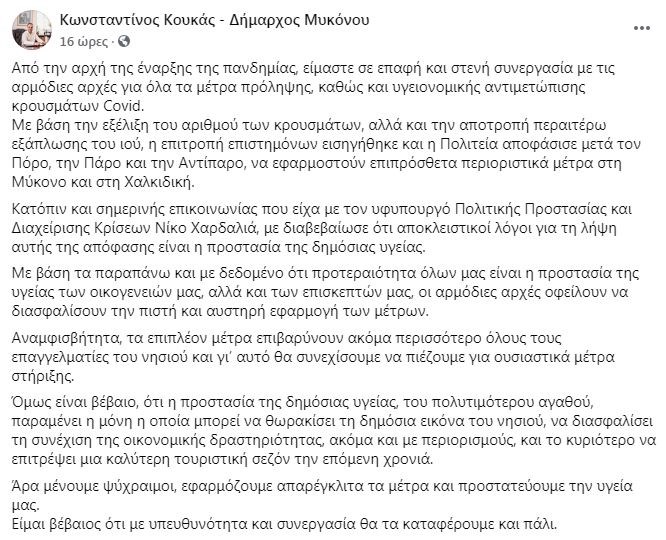 Σχετικά με τα νέα έκτακτα μέτρα που επέβαλε η Πολιτική Προστασία στη Μύκονο στο πλαίσιο αντιμετώπισης της διασποράς του κορονοϊού, ο δήμαρχος του νησιού Κωνσταντίνος Κουκάς τόνισε πως ήρθε σε επαφή με τον υφυπουργό Πολιτικής Προστασίας και Διαχείρισης Κρίσεων, Νίκο Χαρδαλιά, και επισημάνθηκε η ανάγκη της εφαρμογής των μέτρων για να προστατευθεί η δημόσια υγεία.