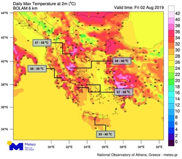 Οι εκτιμώμενες μέγιστες θερμοκρασίες για σήμερα το μεσημέρι θα φτάσουν τους 39 – 40 ⁰C, σύμφωνα με το meteo.gr.
