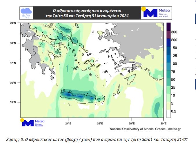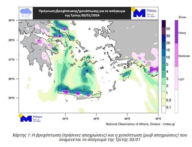 Βροχές και σποραδικές καταιγίδες αναμένονται έως το βράδυ σε περιοχές χαμηλού υψομέτρου της Μαγνησίας, της κεντρικής και ανατολικής Στερεάς, της ανατολικής Πελοποννήσου, της Εύβοιας, της Κρήτης και στα νησιά του κεντρικού και νότιου Αιγαίου. Χιονοπτώσεις θα εκδηλωθούν σε ορεινά και ημιορεινά τμήματα της Μαγνησίας, της κεντρικής και ανατολικής Στερεάς, της Πελοποννήσου, της Εύβοιας και της Κρήτης.