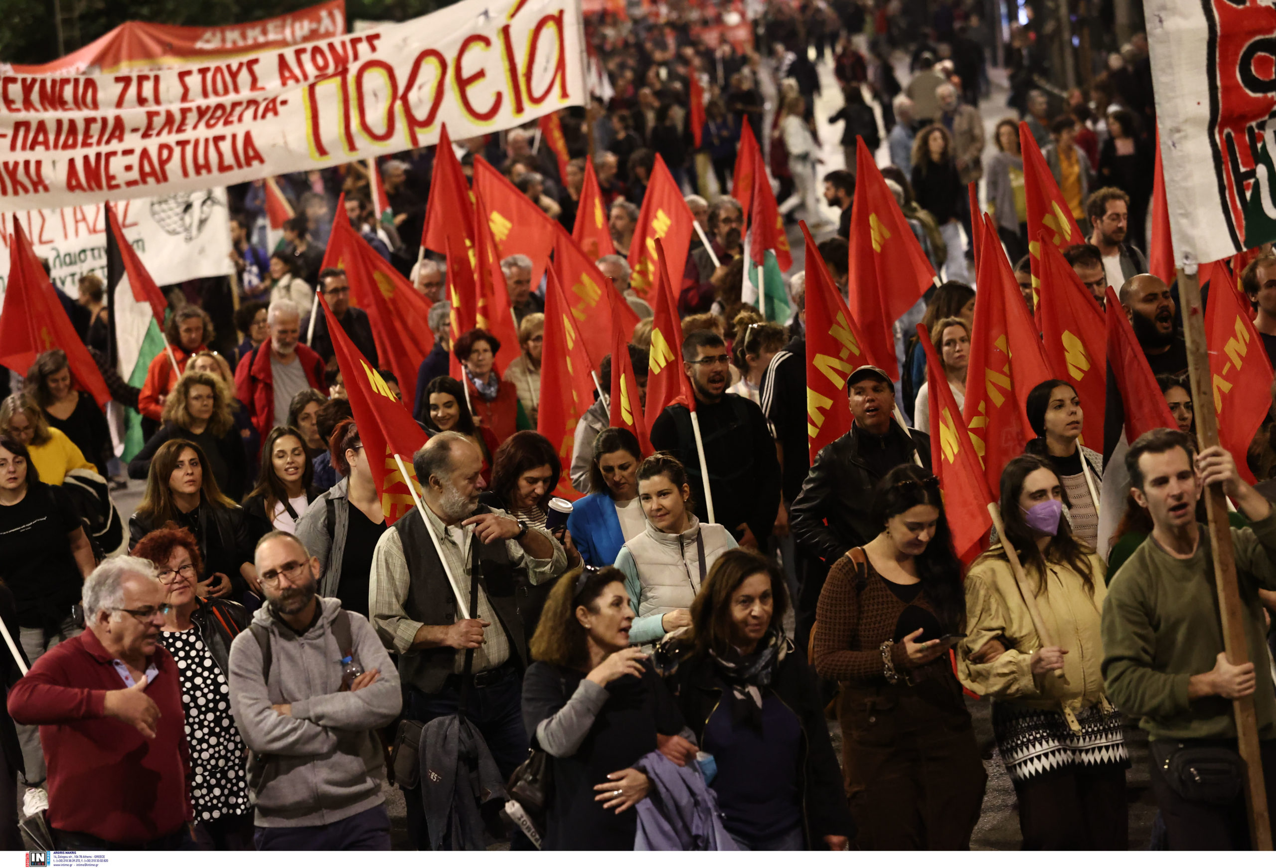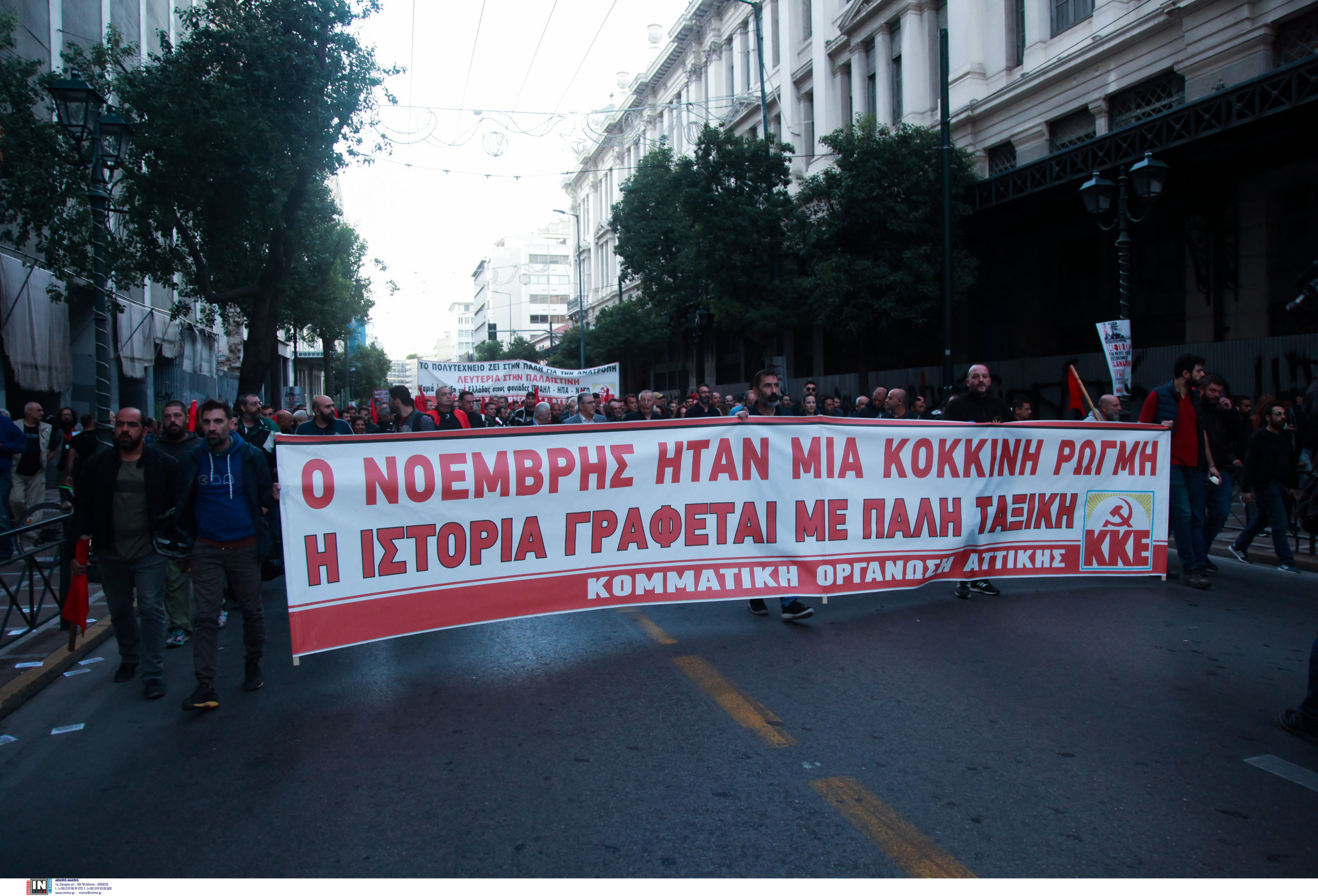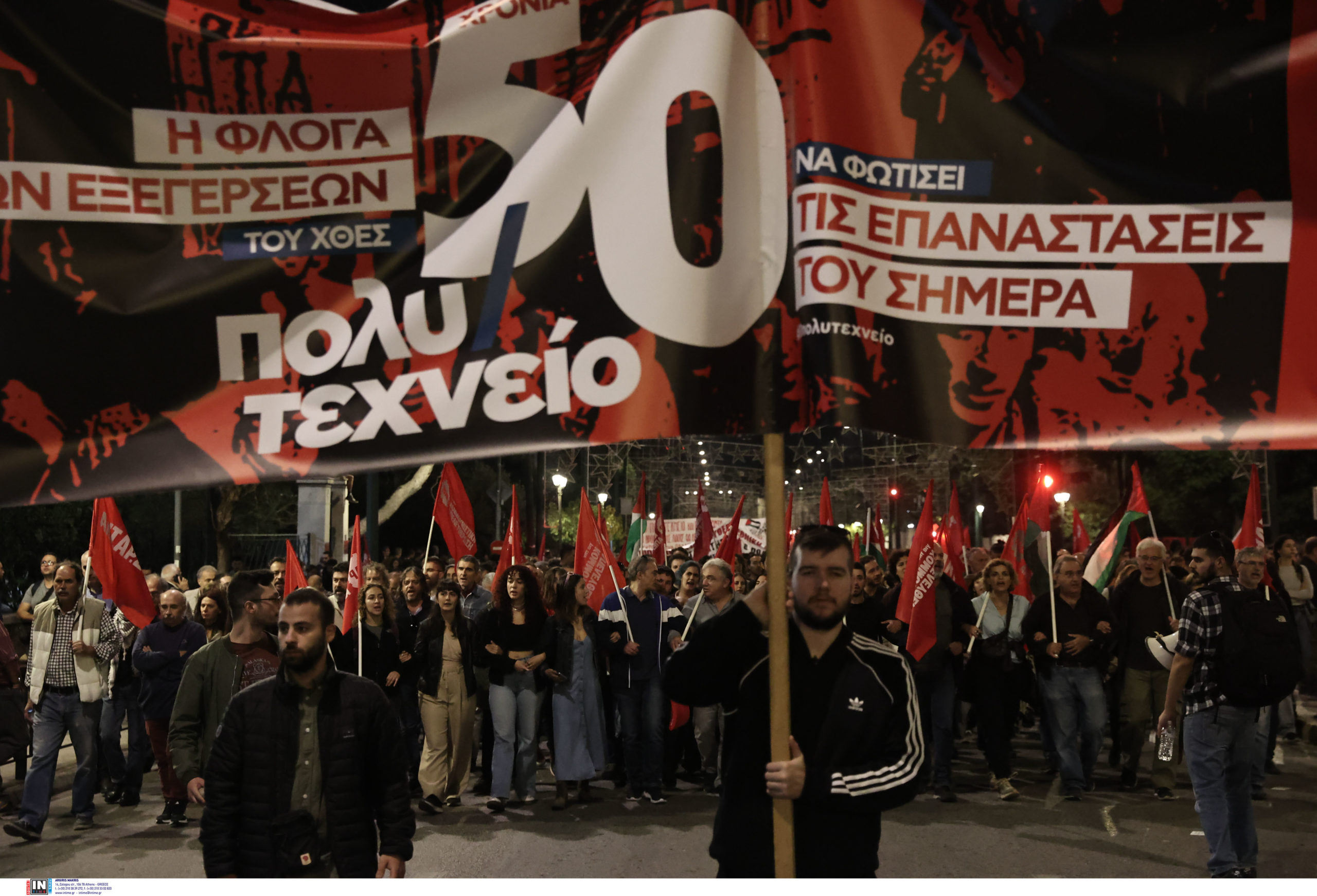Φοιτητικοί σύλλογοι στέλνουν το μήνυμα: «οι εξεγέρσεις δεν μπαίνουν στα μουσεία, εμπρός για της γενιάς μας τα Πολυτεχνεία». Ακολουθούν φορείς, εργατικά σωματεία, τα μπλοκ του ΣΥΡΙΖΑ-ΠΣ, του ΠΑΣΟΚ-ΚΙΝΑΛ, του ΜέΡΑ25, κομμάτων και οργανώσεων της εξωκοινοβουλευτικής Αριστεράς, όπως και συλλογικότητες του αντιεξουσιαστικού χώρου, που συγκεντρώθηκαν αρχικά στην πλατεία Κλαυθμώνος και στο άγαλμα του Κολοκοτρώνη. Με ξεχωριστό μπλοκ συμμετέχει στην πορεία το ΚΚΕ, που έκανε προσυγκέντρωση στη Σταδίου. Το παλαιστινιακό στοιχείο είναι έντονο στην φετινή πορεία για το Πολυτεχνείο.